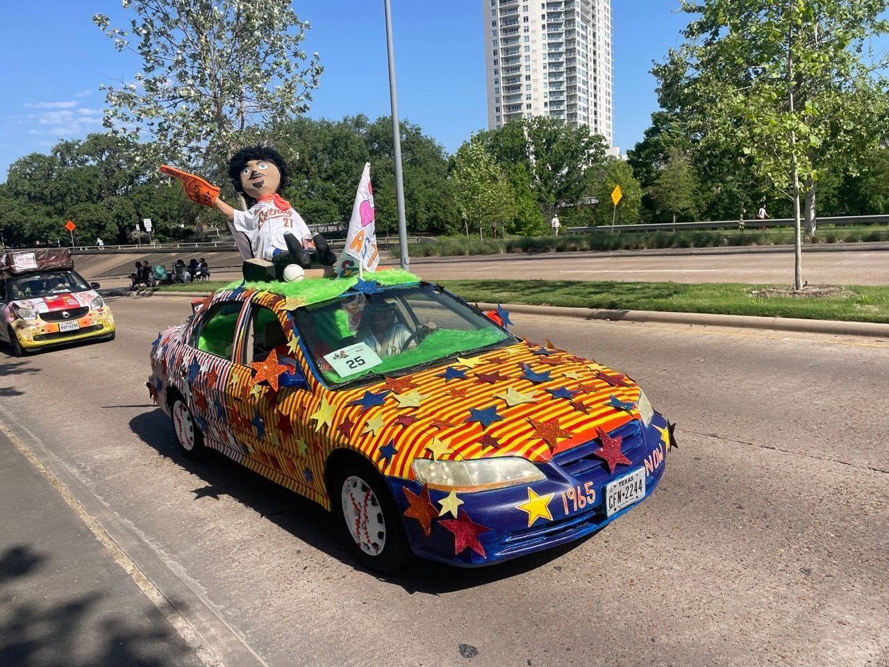 ---- Kolter Loves the Stros is a car showing support for our Houston Astros. It has paint, paper mache, cardboard and glitter---- I have been a HUGE fan of Art Car since I was a teenager. I have been an art teacher at Kolter Elementary school for 7 years and have been fortunate enough to share my love of ART CAR with my students. This is our 4th year for art car and each year my students ideas get bigger and bigger. I love to see them work through their challenges and execute their ideas. My art car is TOTALLY made by the students. I am so proud to see their faces when it is all finished. What I am most excited about for art car is..... EVERYTHING!!!!!