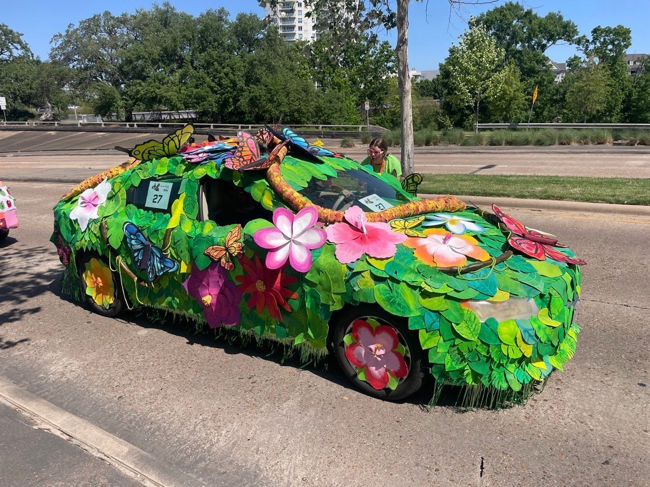 artcar- 3rd - 2023 - Sugar Rush---- "The Wild Ride" is a rolling rainforest brought to life by the creativity of Lovett visual art students! Covered in twisting vines, slithering snakes, vibrant flowers, and fluttering butterflies, this jungle-themed art car is an explosion of nature’s beauty and wonder. By using simple supplies in imaginative ways, everyday materials were transformed. Paper and foam became twisting vines, while paint brought vibrant flowers and fluttering butterflies to life. Paper mâché was molded into slithering snakes, adding texture and dimension to our rainforest on wheels.---- As an art teacher, nothing brings me more joy than witnessing my students' concepts come to life. Inspired by the untamed beauty of the jungle, this art car is a celebration of nature’s wild and wonderful spirit! From the dense, twisting vines to the vibrant butterflies and slithering snakes, every detail reflects the magic of the rainforest. The sounds, colors, and creatures of the jungle spark curiosity and creativity, reminding us of the importance of imagination, teamwork, and the natural world. This rolling masterpiece is not just a car, it’s an adventure waiting to happen!