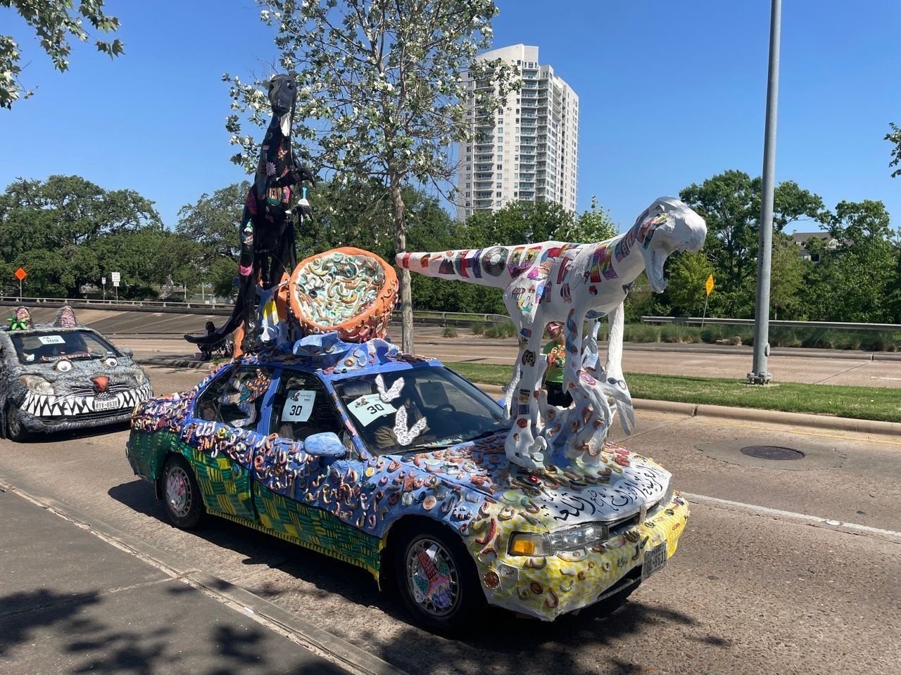 ---- It will be a Honda Civic 1989 manual transmission with three dinosaurs. One will have the head and shoulders erupting from the passenger side door, head facing upward, mouth open. Its tail and lower body will be coming out of the top of the car. Another larger dinosaur will be standing on the trunk. Its small arms will hold a large soup bowl or cereal bowl, inside which are large Arabic letters, which it appears to be eating. A small dinosaur will be standing on the hood of the car or conversely, be towed behind in trailer and be facing the windshield on which there is Arabic script, pasted on for the dinosaur to read. Covering the car will be small ceramic letters of arabic script made of ceramic by students at the school so that the entire thing looks like a concretion or fossil.---- My name is Justin Larson. I’m an art teacher at Arabic immersion magnet school in the past students have participated in our car, but not recently. I’d like to continue the tradition and give students in my various art clubs and other opportunity to participate in the Houston art experience.