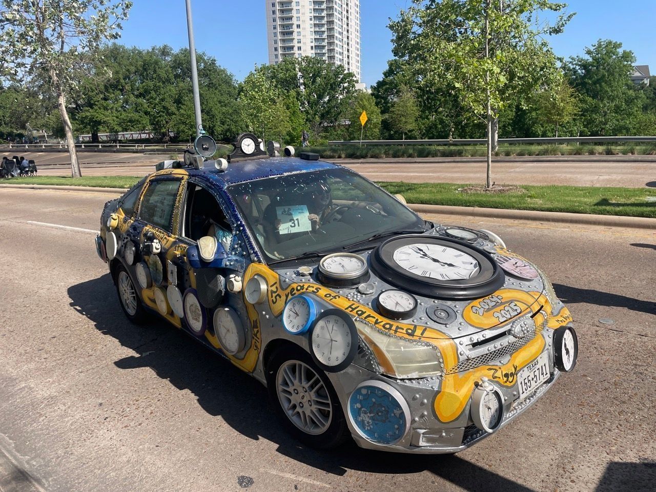 ---- Harvard Elementary School’s art club has put together Harvard’s Time Machine. The car is full of different shapes and sizes and varieties of timepieces, from watches to clock radios, vintage to new. Pick your own advantage and time travel to the past or the future, and enjoy the ride along the way.---- The Harvard Art Club (grades 3-5), but the car theme to vote. The entire elementary school could submit their choice and a resounding victory went to the Time Machine theme. The kids will work on sketching the theme, and bring that to life on the car. They will spend January-April working on the car.