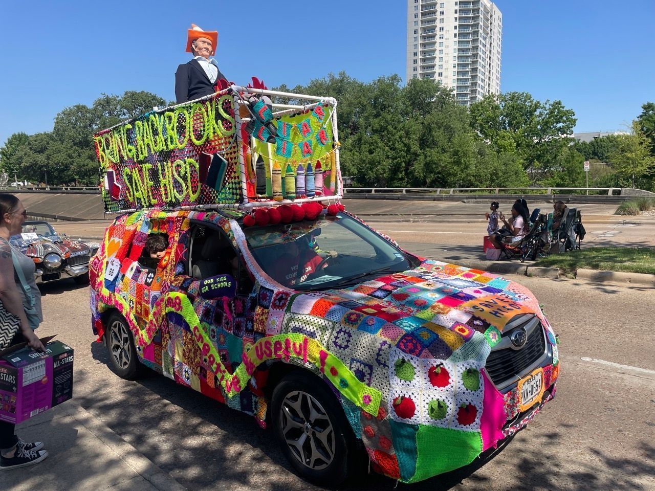 ---- HISD is under attack. The Arts, creative thinking, and joy belong in public education.We will not allow our community to be destroyed. We are fighting for it, one stitch at a time. Our yarn bombed car is made of crotchet, knit, pom- poms, and other yarn pieces. It represents hours of work by many yarn artists of all ages and skill levels. Some of our artists just learned to crochet and donated their first pieces to this project, while others have been crafting fiber arts for many years.---- Houston Stitching Together formed as a response to the hostile state takeover of HISD. We are parents, teachers, students, and community members from all over Houston, united to fight for our schools. We have watched Mike Miles and the appointed board of managers strip our schools of creativity and joy. We are here to bring it back. We have been crafting creative yarn displays throughout Houston to raise awareness about the real effects of the state takeover on our schools for almost a year now. The Art Car Parade is a unique, joyful , and creative Houston event. We can’t think of any place more fitting for us to display our work. We are having so much fun making an art car!