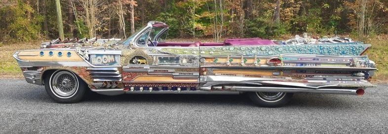 ---- David Best, a modern master of assemblage who has transformed more than 30 vehicles into mobile works of art debuted this car in Houston’s 2007 Art Car Parade. Beginning as a ’62 Cadillac convertible it was modified with an assortment of other cars’ parts - additional Cadillac fins, ‘63 riviera headlights and fenders, ‘55 Cadillac bumpers along with a variety of truck cab lights.