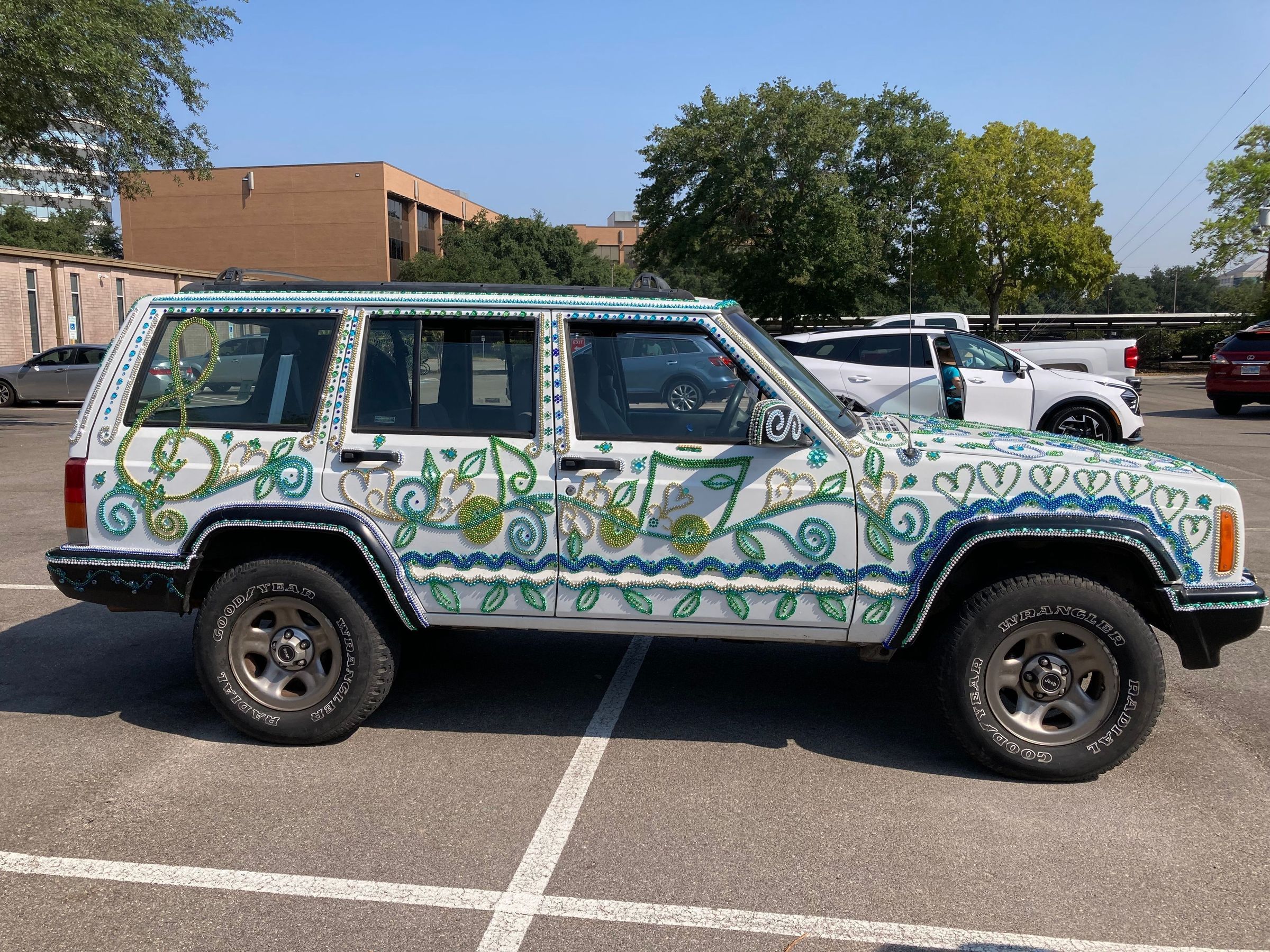 ---- A musical hearts & flowers design in my favorite colors of Mardi Gras beads and glass beads---- My previous design for this car (Jeep) was called the Jeepadoodle, which was Sharpie-drawn doodles. It faded and the clear coat peeled off after only 2 years, which was discouraging. After attending a few more Art Car Balls, I was inspired to "glue shit on it." E6000 is wonderful! And I love the Art Car Ball, but I liked the indoor one the most. Don't remember the year -- 2018?