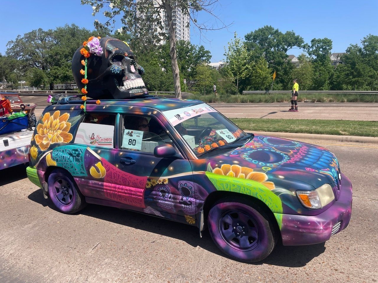 To heighten its presence in the parade, LED lights beneath the vehicle shift colors, creating a mesmerizing glow that illuminates the night, symbolizing the guiding light that leads spirits back home. The hood features a giant sugar skull, surrounded by celestial elements, bridging the earthly and spiritual realms.