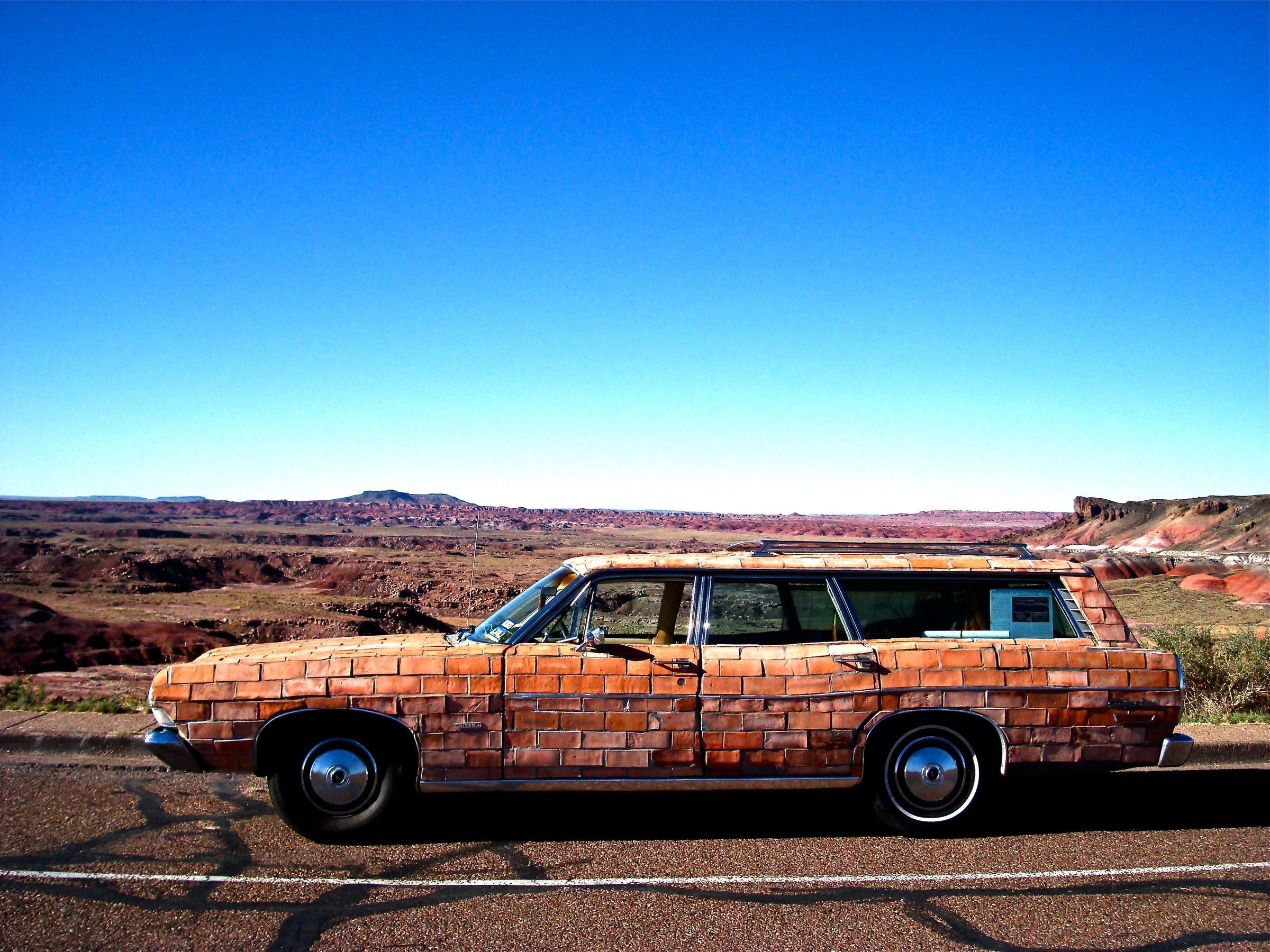 artcar - 3rd 2016 - Brickmobile---- The Brickmobile is a1968 Ford Country Sedan covered in ceramic tile “bricks”. The station wagon is a monument to the nostalgia of car pools, V8 engines, and streets named Pleasant Valley. The car looks heavy and it is, however it is equipped with a 390 V8 and all the added weight equals only about 1000 pounds.---- In his studio practice Monroe uses common materials to create pieces as diverse as functional lamps, kinetic sculptures, fountains, waterfalls, and outdoor sculptural works. Artcars are a great “vehicle” for collaborative work. His large scale, site-specific installations have been exhibited at several Houston public venues including: Project Row Houses, The Glassell School, Lawndale Art Center, and DiverseWorks Art Space.