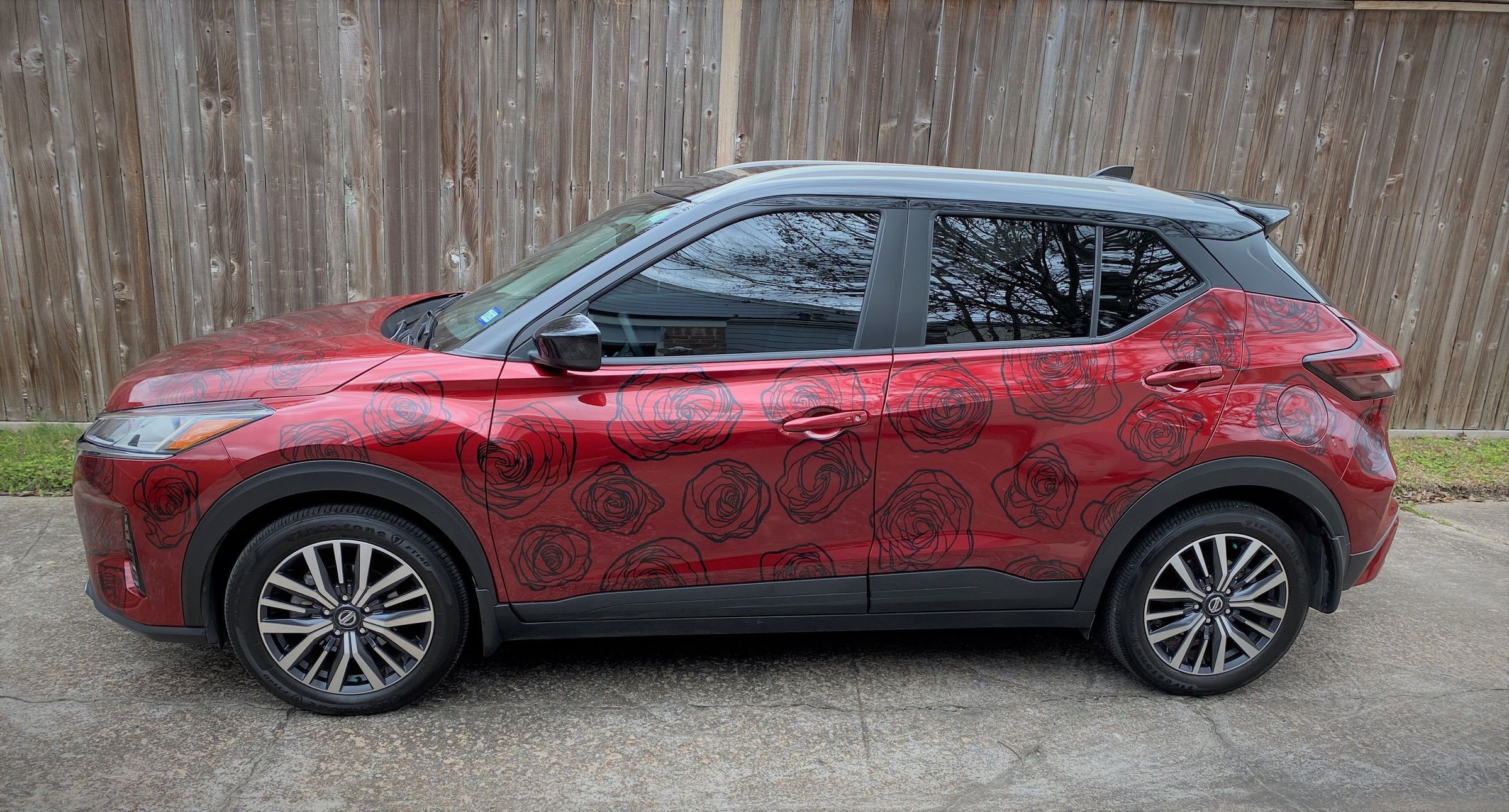 Painted-2nd-2024/3rd-2022/ 2nd 2007/ daily driver 3rd 2017---- Rosy is a floral art car and is my fifth art car with flowers on it. The car's red rose base color came straight from the factory and was the inspiration for painting the black outlines of roses onto it.---- I drove someone else's car in the 1999 art car parade. The event was so much fun that I wanted to participate with my own daily driver art car the next year. I have been driving art cars ever since. After 25 years, I can't imagine driving a car that is not an art car.
