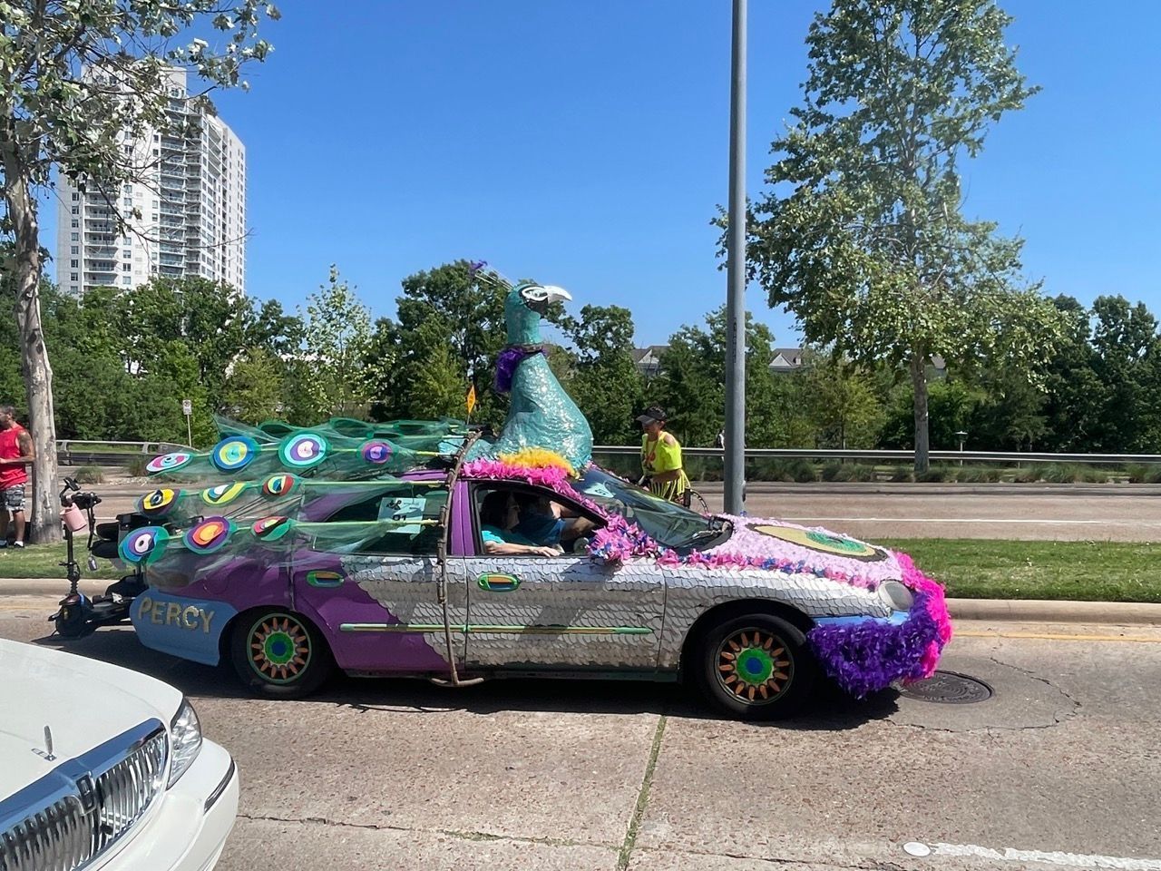 Materials include feather boas, rebar, PVC, tulle, and most likely by now 1000 pounds of hot glue.---- Sam & Nancy's art classes were studying the art of James Audubon, and decided to turn a car into a giant bird.