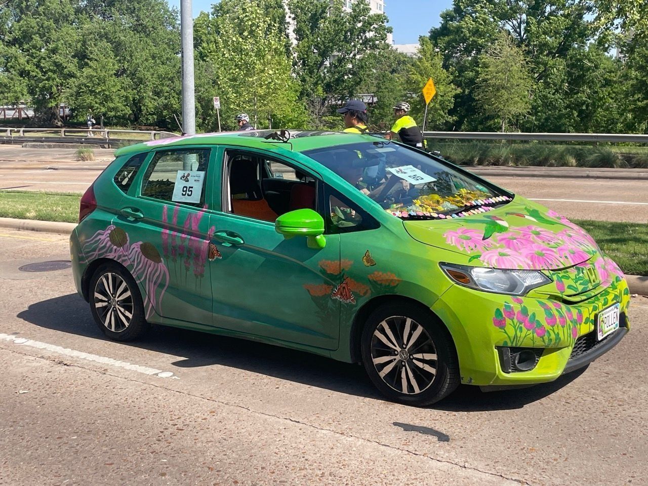---- Artist Terry McDaniel painted her blue Honda fit into a pollinator garden. This garden is constantly growing and more and more pollinators come each year. Terry is a beekeeper and her Pollen Car is a great reminder to plant more native plants in your yard for your local pollinators. You may see her also wearing her bee skep full of about 20,000 honey bees. Feed the bees, plant more flowers!---- I came to the parade last year for the first time with a few friends and the Hippie Van. I loved seeing all the cars and meeting the artists. I especially enjoyed the Thursday cruise to different places and the ArtCar Ball. I get inspired by doing public art, gardening, beekeeping and from meeting other artists and traveling. I made my art car because I was originally riding in events here with the ArtCar and ArtBike crew here in Mpls as an ArtBiker. I am not a winter biker but loved hanging out in this group so I started turning my car into a temporary ArtCar and now I am a daily driver of my ArtCar. It’s still in progress, the winter's up here are not so conducive to painting outdoors. I love driving my Pollen Car especially in winter. It gives people joy and hope for a more colorful time is on its way here in MN. I’m looking forward to this year's festival.