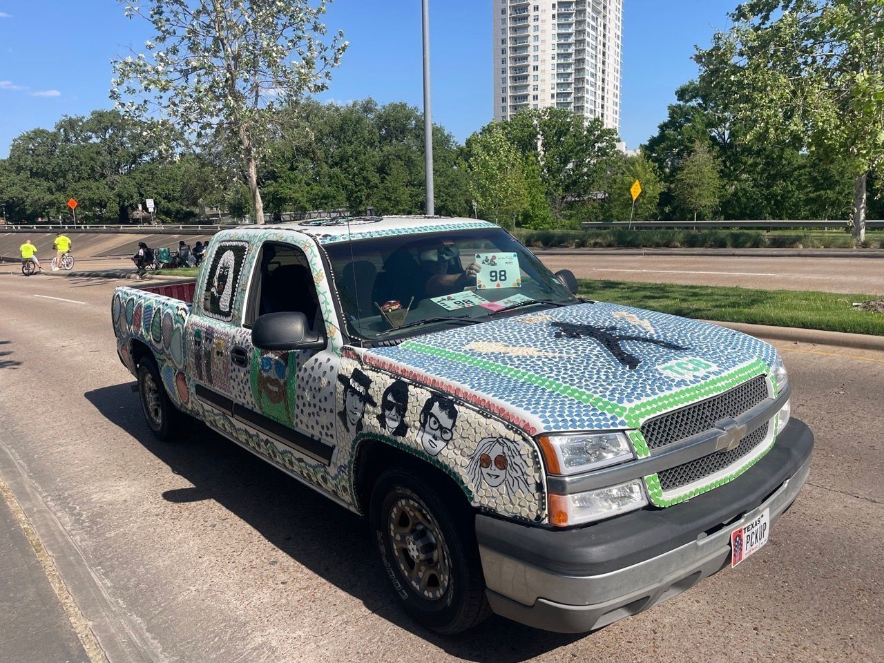 We chose a music theme with and created portraits of Texas artists on the passenger side, and iconic Rock and Roll artists on the driver's side. We have Elvis on the hood taking care of ` and Kiss on the roof! And to complete the look we have lyrics on the truck bed that are so ubiquitous that you can't read them without singing them in your head! See if you can remember who sang the lyrics!---- We LOVE to see live music. We go most weekends. I inherited this truck from my father-in-law, who also loved music. We came up with the idea as a way of honoring our combined love of music. The Art Car Parade is such a fantastic expression of rolling passion. I love seeing everyone's efforts, I love rolling down the road with a bunch of likeminded friends, and most importantly, I love the SMILES and CHEERS from everyone along the parade route! I try hard to acknowledge the youngest of fans as we make our way around the route, but pointing and making eye contact, trying to make the event as special for them as it is for us.