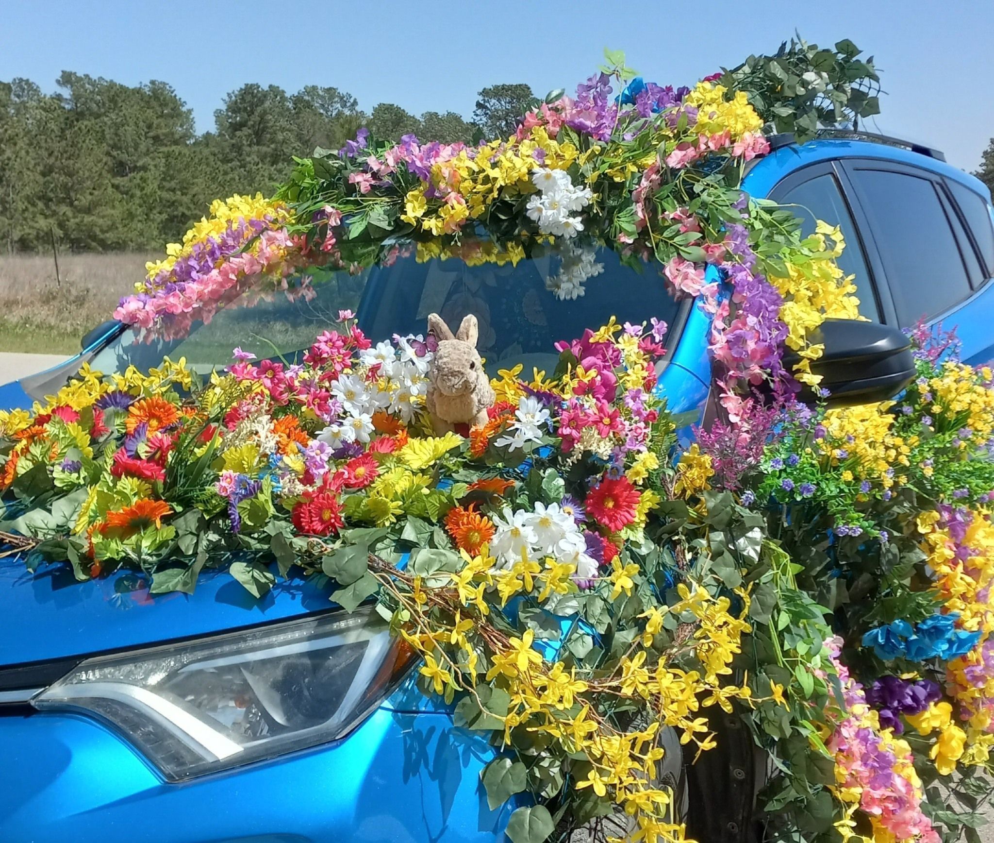 ---- Magnets hold the key to a regular blue RAV4, transforming it in mere minutes into THE POSEUR MEADOW. Pre-assembled faux grass sections of flowers, butterflies and bunnies are attached to the car's panels using extra strong magnets, with a spot of removable vinyl on the car to prevent scratches. Anyone can do this - fun for the whole family!---- Art Car Week brings me back to Houston and memories of my youth. I've attended over 30 parades and it never gets old. I hope this parade goes on for decades to come.