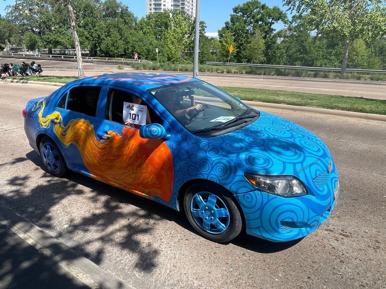 ---- The Craigmobile is a combination of my love for color, pattern and sea life. It has a bright blue background with rings of darker and lighter blues bubbling from each end. There are four larger than life orange and yellow jellyfish flowing across the sides of the car.---- Im 16 years old (I’ll be 17 by the parade) and am currently a student at HSPVA in the visual arts department. I’ve been completely obsessed with art of all kinds since I can remember and can’t go a day without it. Music and visual arts especially have been hugely impactful in my life and I really do see them as sort of companions. Thanks to my amazing school and all the my amazing art teachers I’ve gotten to try many different mediums such as photography, video, painting, drawing, ceramic, wood, mixed media, sound and performance. However I have no experience with cars at all, so when the opportunity of the art car was presented I was honestly very intimidated but excited. I never work with metal and I know nothing about cars but I was determined to complete it on my own from start to finish. I couldn’t have done any of this without my dad’s support. He provided me with a car of my very own, and all the support and encouragement I could ask for.(