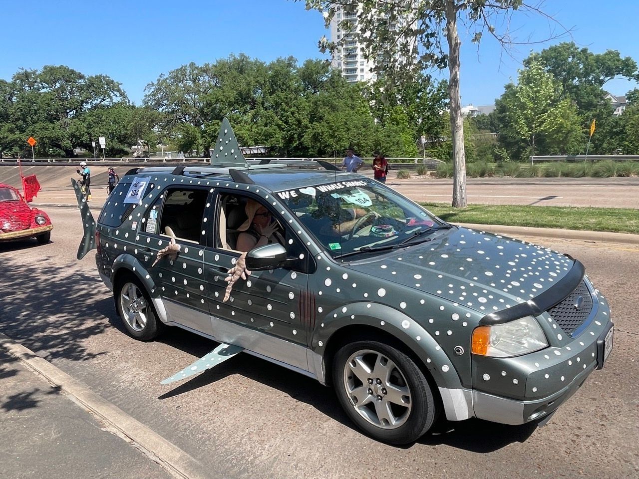 ---- The whale shark was created by Linden Bartell age 9 and Laurel Bartell age 8. They were inspired by whale sharks seen in the Georgia aquarium in Atlanta. Inside the dots of the whale shark are QR codes linking to educational videos and live trackers of actual whale sharks. You can scan the car and find stats and actual locations of whale sharks in real time.---- Linden and Laurel attended the Art Car Parade several years before deciding to create their own car. They inherited this car from their great grandparents and designed it all on their own. They love meeting people and sharing their love for sharks and marine biology in general. Linden hopes to grow up to be a marine biologist. Laurel wants to bake cakes.