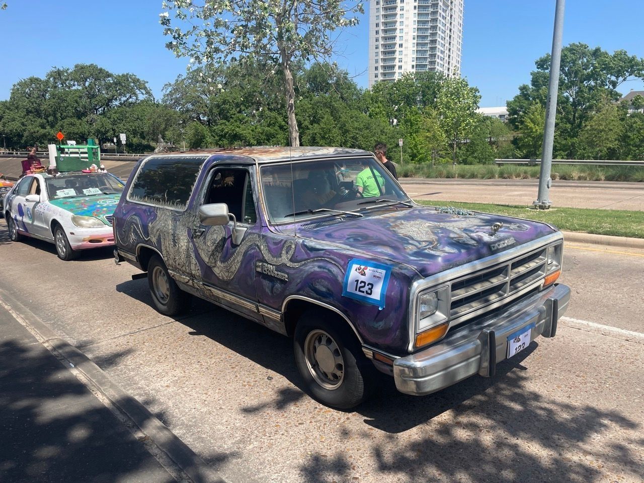 ---- Dragons are on the sides and hood of the car via mirrored mosaics.---- We have been interested in art cars for decades. Before we married, one of our dates was to the Art Car Parade, and we decided that we needed to have an art car. Later, with the help of our wedding guests, we created With This Truck, I Thee Wed. After its first parade, it was repurposed into Jabba The Truck.