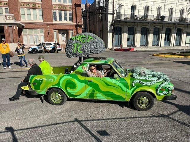 Artcar - 2nd - 2019---- Our ArtCar is a 1979 Subaru Brat. She was my college car. Our son, Tobin, was diagnosed with a brain tumor when he was 11. We treated it, but it came back when he was 19, and when he realized he was not going to have time to do the things he'd hoped to do, he decided to start a non profit, helping families with children who are fighting cancer with their travel expenses. Tobin didnt get to see the car finished, but he told us what he wanted. Paint it all colors of green, his favorite color, a giant octopus on the hood, his favorite animal, and a giant brain on top complete with light up synapses, symboizing his battle with brain cancer, so that's what we did. The brain and octopus are made of maybe 20 cans of srpray foam insulation. Weve added lots of lights and glitter over the years, because once you start arting your car, ya just can't stop!---- I've had the little Brat since she was new, and to be honest, she was always a bit of an ArtCar. I have wanted to Art her up since i went to my first ArtCar parade, and finally did with inspiration from my son Tobin. Having been in the parade, and participated in ArtCar week for the past several years, i have to say every car and every artist inspires me! the creativity and fearlessness is a constant source of motivation. It's impossible to pick a favorite part of ArtCar week, but i know I am really looking forward to seeing all of the folks we havent seen since last year.