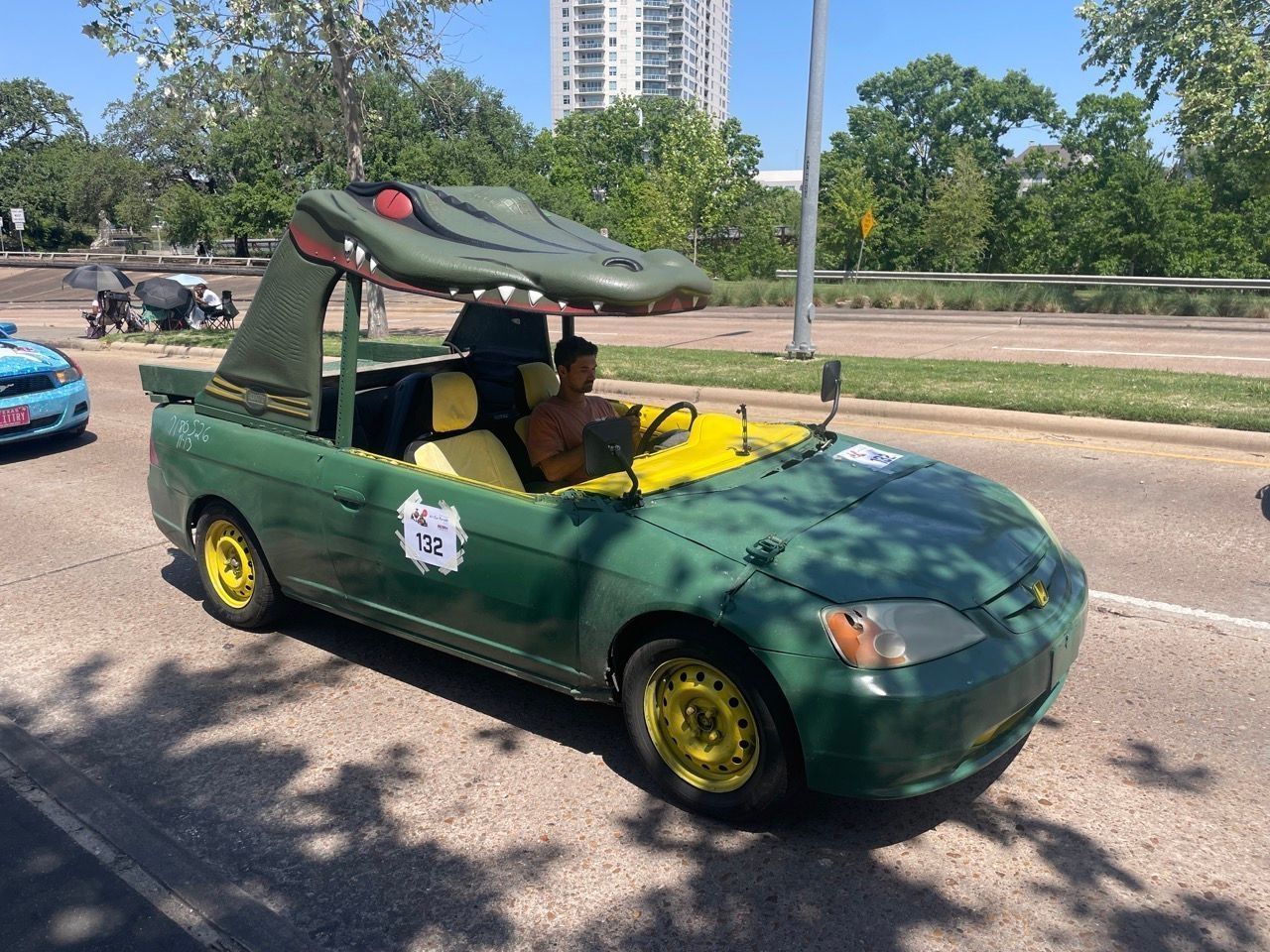 ---- Gator Car is the ultimate bayou bandit. The green machine from Dallas is sliding into swamp city on its own power to spread joy and eat up the competition. Inspired by Steve Irwin and Lacoste, Gator Car lives on a 2001 Honda Civic chassis and runs on freshwater fish, small mammals, and good times. It's croc top is repurposed from a John Deere special edition all-terrain vehicle, boasts a custom yellow interior, and has a custom truck bed in the rear so it's a party in the front and business in the back.---- My name is Paul Snyder, I am a car and motorcycle content creator from Dallas, Texas. I was inspired by the rich Houston car culture and the long history of Art Car in the city to spruce up my Gator and bring her down to the bayou. I decided to design and submit Gator Car because I've never seen anything like it, and a big part of my content is about pushing boundaries with vehicles and bringing my wild ideas to life. I'm most excited about seeing the other cars, meeting the other artists, making people smile, and celebrating the art scene in Houston.