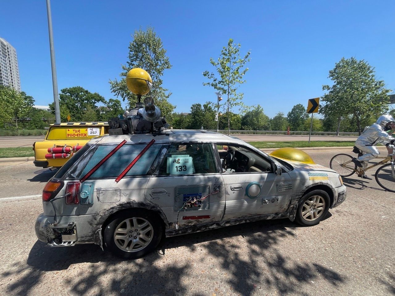 Contraption - 1st - 2023,2024 - ---- I acquired a 2003 Subaru Outback from a friend who is a mechanic and, and transformed it to be fun and intergalactic, using 100% repurposed parts and upcycled materials. Its going to be the only one like it in the entire galaxy. Hooray!---- Im a full time artist in Northeast Oklahoma where sculptures of robots, rayguns animals and all things sci-fi out if scrap parts, repurposed materials and trash. i loved the Art car community and the new friends i have made. so ive made a couple contraptions but have always wanted to make an art car. or at least the past few years since ive been talking to Chris W and Charlie L. ha.