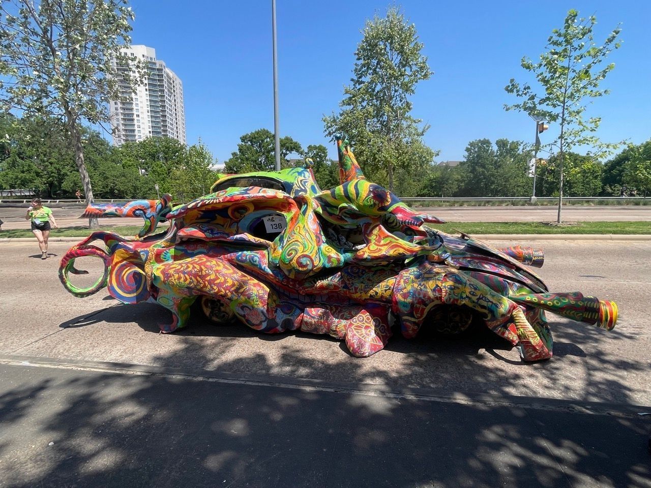 Ann Harithas legacy award SpaceRider-2023/ the Ploppet 2024---- Shaman mesmerizes any and all who dare to stare! Here comes the wildest minivan of the ultra dreamworld, staring right into the next dimension! A spunky combination of fake Ferrari body parts, spinning spiral sculptures on the drivers side and a warped wizard’s face on the passenger side complimenting the fully functional luggage rack, which also doubles as a bohemian top hat! To create this creature; a mish mash of wooden blocks form the skeleton, metal lathe and rubberized bathroom caulk create the exterior finish and have been coated down with an ultra vibrant paint job for maximum fun factor! Shaman dares to take reality to the next level, through the glass ceiling and straight to the street!---- We’re inspired by taking mediums to the absolute max and creating extreme builds for entertainment and inspiration, both for ourselves and others. Experimentation of new mediums, absurdity and pushing self expressionism to the limit are our major themes. We aim to bring novelty and whimsy to the parade, day to day lives of anyone who sees the cars and our lives by driving these contraptions. Art cars are a huge passion of ours and we hope to bring them to as many eyes as possible while creating a ripple that inspires others to create their own and stretch the imaginations of what’s really possible here on earth! We will drive art, live art and be art our entire lives, it’s our calling!