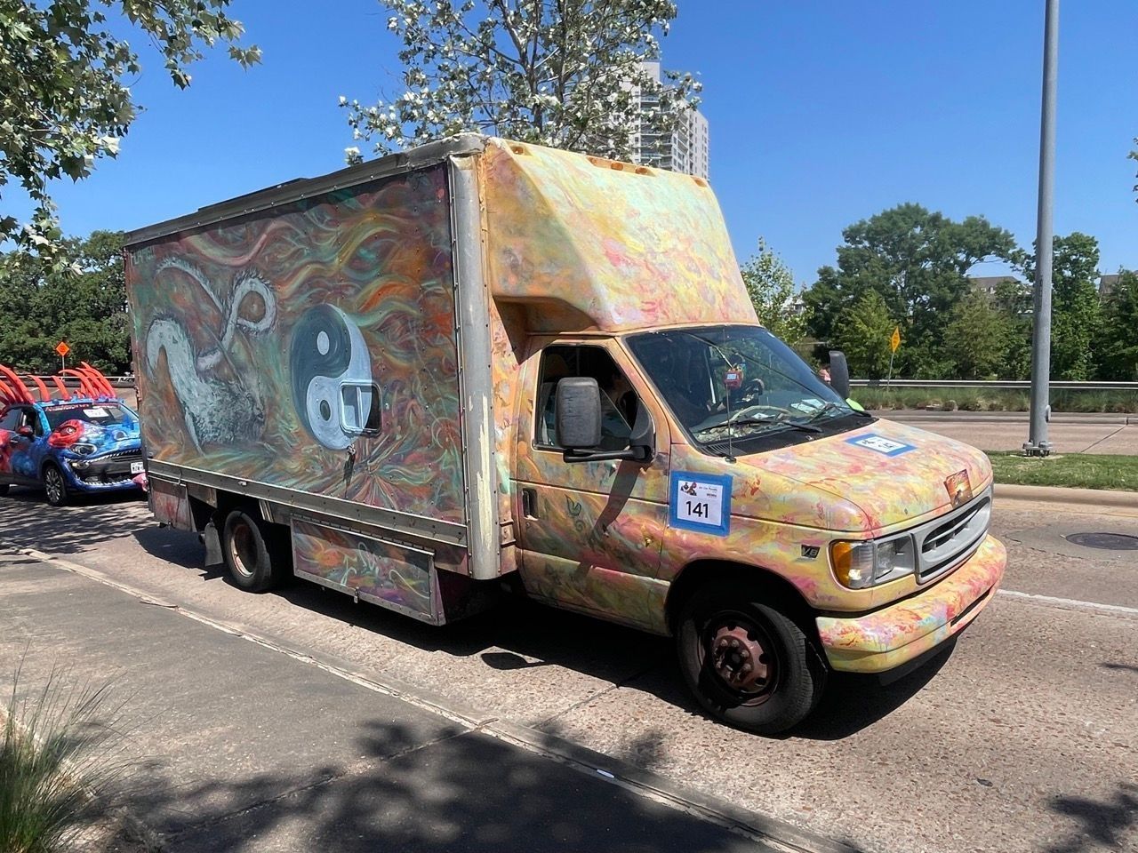 ---- Sheila is a mural box truck that reflects my love of freedom, whimsy, and love. As my daily vehicle, mobile workshop and artist den, she is a part of me and I am a part of her. She is painted all over with 2 large mural walls on each side, as well as her back. The back door is a giant anatomical heart atom that represents the love and energy that connects and creates all things. The is what the Flamgu means. One side is a parrot opening its wing with a girl looking out into the beautiful landscapes of America that we cruise. The other side is the nighttime dream portal with a friendly looking cat dragon observing a yin yang symbol in an energetic dream landscape. She was painted using rollers, mops, latex paint, as well as paint brushes, spray paint and stencils. While staying with my artist friend in Joshua Tree, she transformed from a sketchy looking white box truck into a flamboyant sunset guuurl. He said the art would protect me and it has totally transformed my life! We meet so many people with her paint job. She is my biggest blessing. I hope we inspire others to follow their dreams, take flight, and love life.---- Claire and Kyle Johnson first brought Art Car Week to my attention. They were the first people I met who made art cars and theyve become one of my absolute favorite things in life. All the people I meet who make these are just the coolest, most inspiring people.. and we are all different!