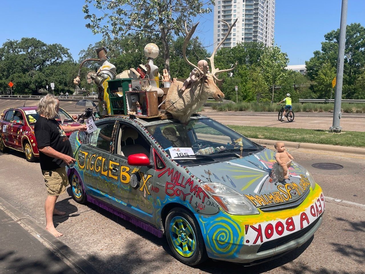 artcar - 1st 2023 - Gretapocolypse---- This painted car is inspired by Rick's novel Mallmart Boy, the almost true tail of the Walmart wolfchild who grows up undetected inside a store and comes of age in time to save the world from the shopaday blues.---- Rick is a writer and artist and 30-year veteran of the Houston art car parade. He lives in the Arizona desert with his 5 ferrets.