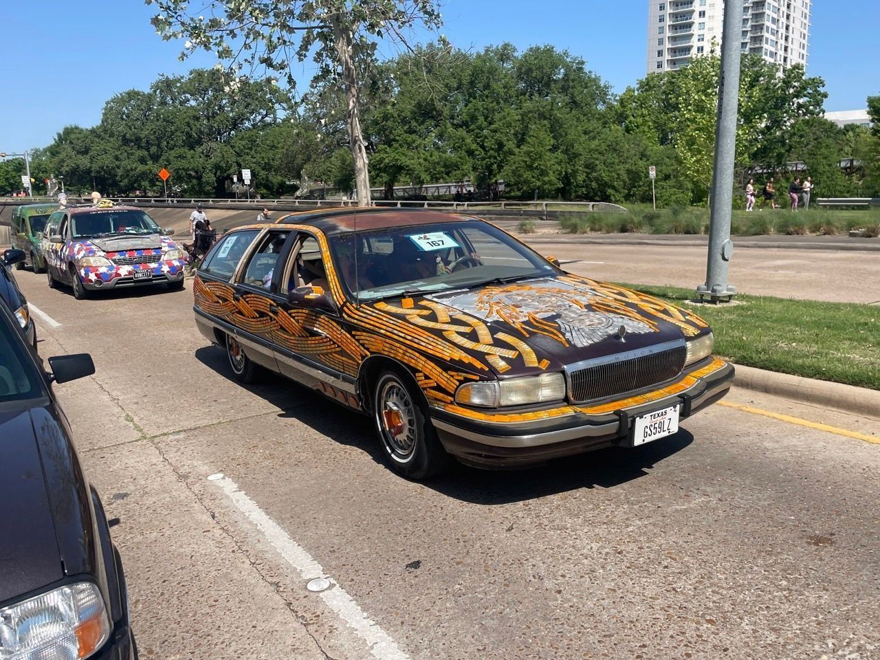Reflectra’s concept evolved from divergent sources. Inspiration originated from: jewelry design, reflective jogging and biking apparel, Union Pacific™ railroad locomotives, with their reflective red trim, an interest in vehicle conspicuity for safety, and other artcars, especially Tim Klein’s magnificently executed Yarn Car.---- For years, I spectated at the Houston Art Car Parade. I always came back wanting to make an art car. Eventually, I had a concept that I would be proud to drive every day, so I pulled the trigger and made BUICK REFLECTRA! Participating in the art car community has been rewarding. Interesting, intelligent people!