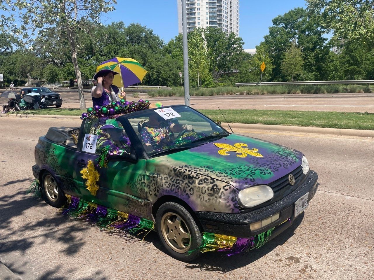 ---- Previous art car from Deb Elliott bought by Ken Crimmins that I purchased and reimagined for Mardi Gras Fat Cat Car. Car painted Mardi Gras colors and leopard print. Yellow fleur de lis decal custom made for hood and doors.---- I have been part of the art car community as a friend for a long time. When Belinda said she was selling cars - my friends encouraged me to do my own art cat. I am a Nola girl who loves Mardi Gras and all this leopard print. So I combined the two things I loved for the car.