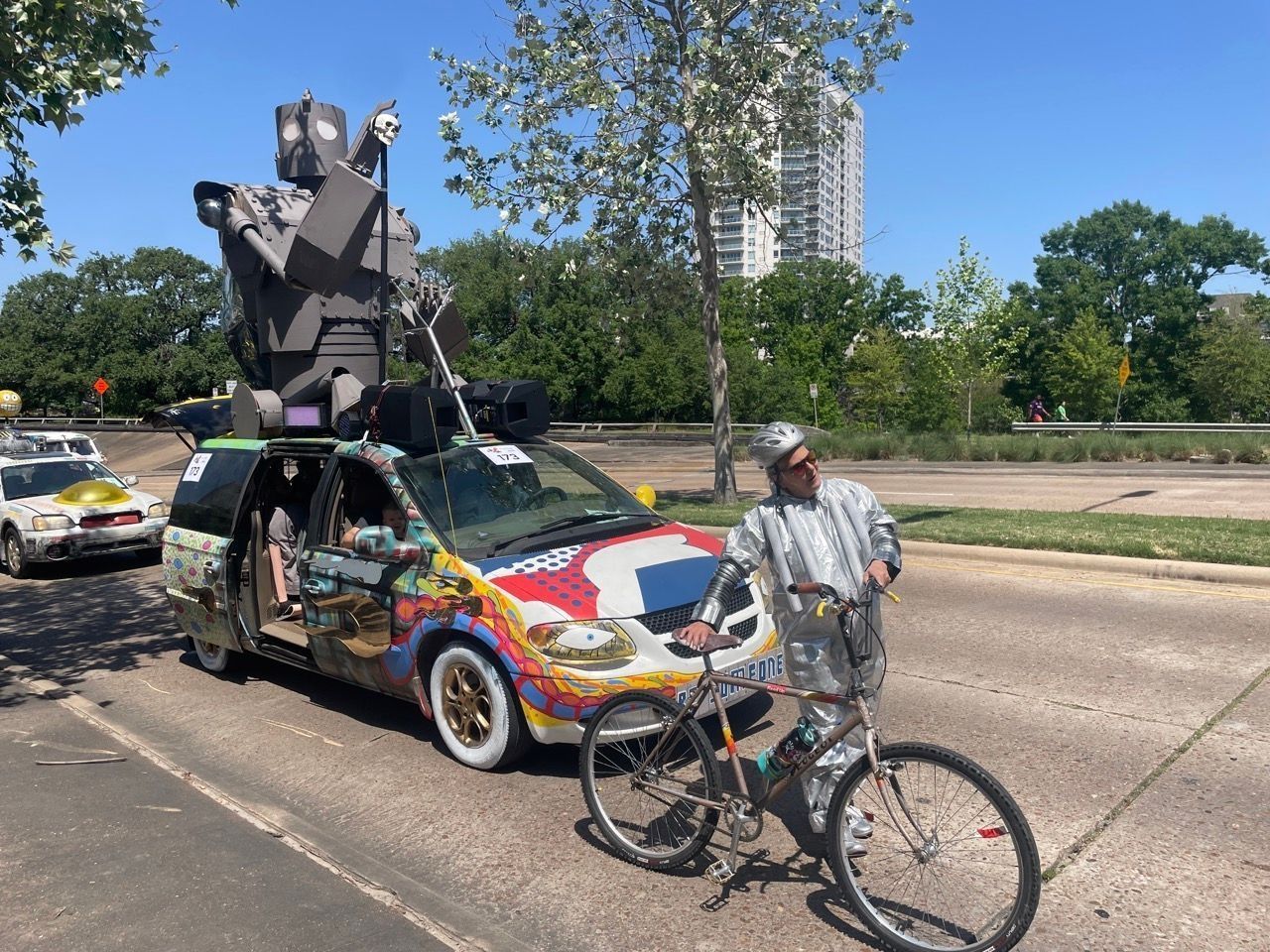 Best Party While Driving-2024/Performance-1st-2022-No that way now/ 1st 2018 - Viva la Deathstar/Artcar 3rd 2001/---- Steely Stan was hanging out in the junk yard and over heard somebody talking about the Art Car Parade. This seemed like something exciting. So he gathered some material together to make a car and called some of his friends. This is going to be the funniest day of his life.---- The idea of making mobile art is exciting to me. I also introduced it to my coworkers and now they or hooked.