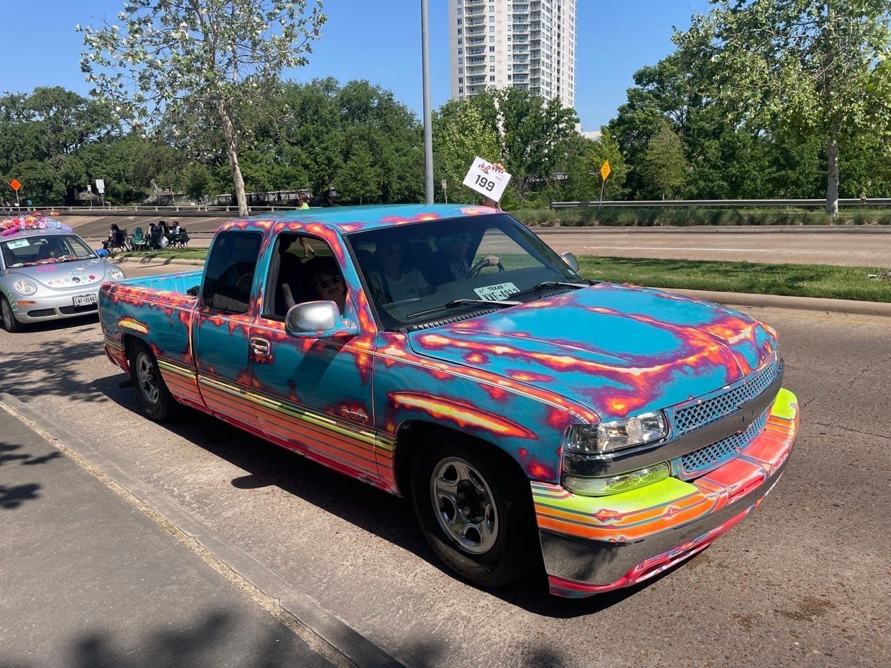 Painted Car - 3rd - 2015(P40-S10)---- It’s a 99 Chevy Silverado that was headed to the burn yard at the local fire department. I was able to save it from its fiery death and turn it into the brightest work truck ever. The truck was painted 7 times consecutively, base white, neon yellow, neon orange, neon red, neon pink, purple, blue/cyan, then a neon retro stripe job was added on top of the blue. In total it took over 150 cans of spray paint to complete. Then I spent 6 months sanding back down through all the layers of paint to reveal what I call a “Jawbreaker Patina” paint job. Then it was covered in two coats of Sour Lava super shift pearl and followed up with 6 more coats of urethane clear coat. In total it took 14 months and around 500 hours to complete the body work and paint job from start to finish. It is now my daily driver work truck!! I also did a full front end swap from a 1500 to a 2500HD. It also glows in black light!! The truck is lowered with chrome wheels and a hand crank air raid siren. With a trailer decorated to match.---- I am a local self employed mural artist, metal fabricator, sculptor and paint vehicles from time to time. I’m a huge car enthusiast and outdoorsman, but most of all I love spending time with my family. My little 3 year old daughter helped me with the truck and when she is old enough to drive it will one day be hers. I always have a tendency to paint just about everything I own and this truck was no different. It was a fun little project that got way out of hand, but it was 100% worth it. Honestly the thing I’m most excited about for the art car parade is bringing my daughter, family, friends, and neighbors out to get the full Houston art car experience. For a lot of them this will be their first time attending and I can’t wait to see their reaction and make memories!!