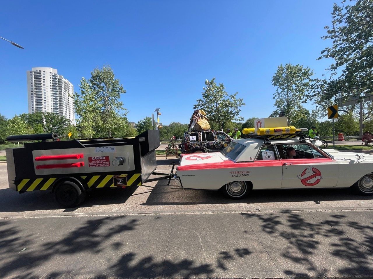 ---- Ghostbers patrol Jeep, themed in the look of the Ghostbusters car. Uses fog and lights, along with music---- Part of an on going Halloween display, fusing old and new elements to the vehicle.