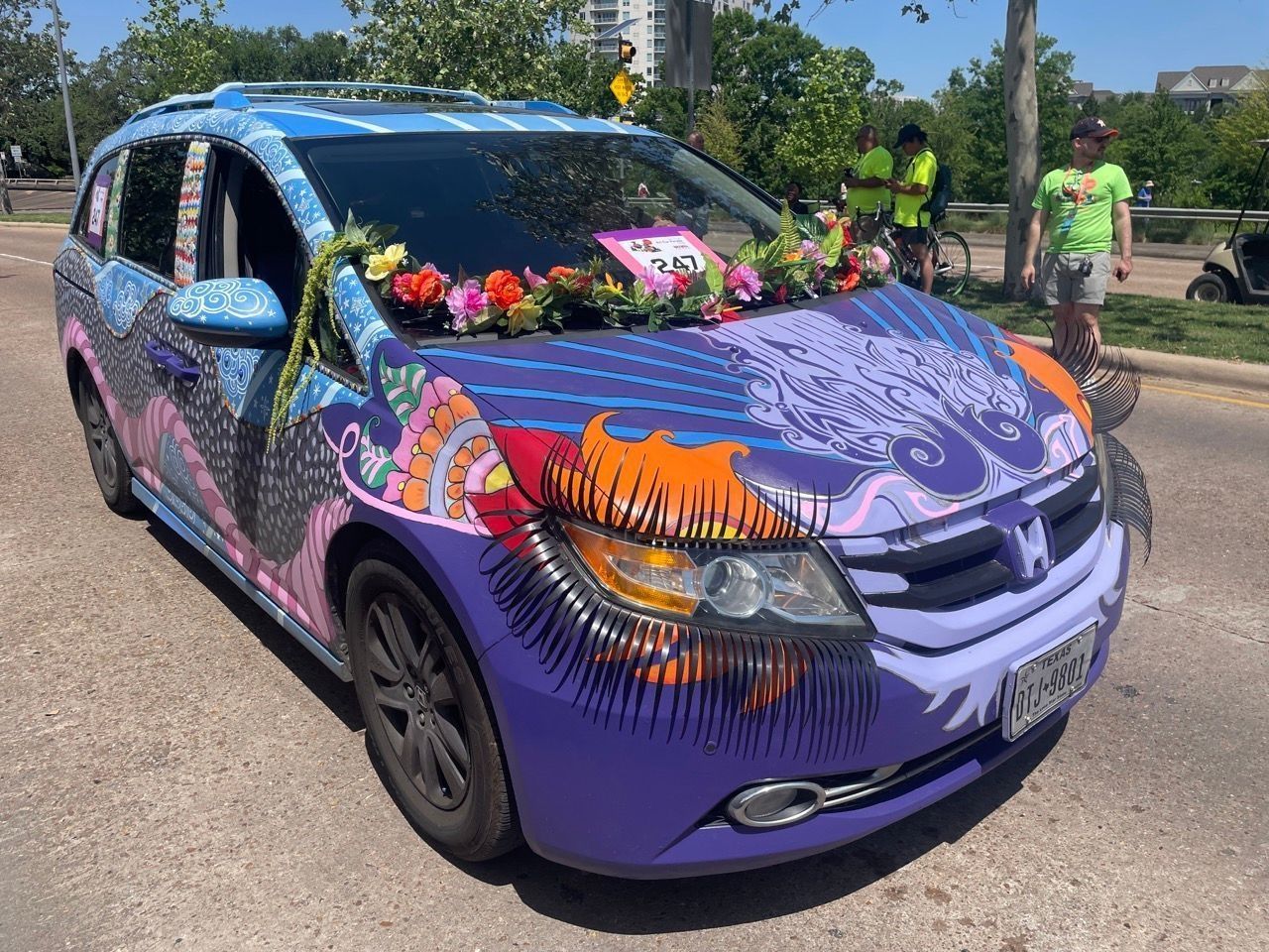 Painted car- 2nd- 2022---- The Lady Dragon Wagon was born to banish those mundane days with a touch of fierce, fun, and girly magic. It's the ultimate mom-mobile, embodying reliability, care, and an ever-present smile. Inspired by my Chinese heritage, the dragon wraps around the vehicle like a protective mother, shielding her children. She soars through the skies, inspiring those she loves to reach for the stars and beyond. Every day, she fills my heart with joy and wonder.---- My husband and I dove into the world of art cars thanks to his passion for art and my love for crafting. We wanted to sprinkle his creativity into our everyday lives. Once we started, there was no turning back, and now we both have our own daily drivers. We love learning new techniques, getting hands-on with our creations, and dressing up in fun costumes. Every year, I eagerly await Main Street Drag because it lets us bring art to those who can't make it to the parade. Seeing the smiles on the kids' faces and the joy in the seniors' eyes is incredibly rewarding.