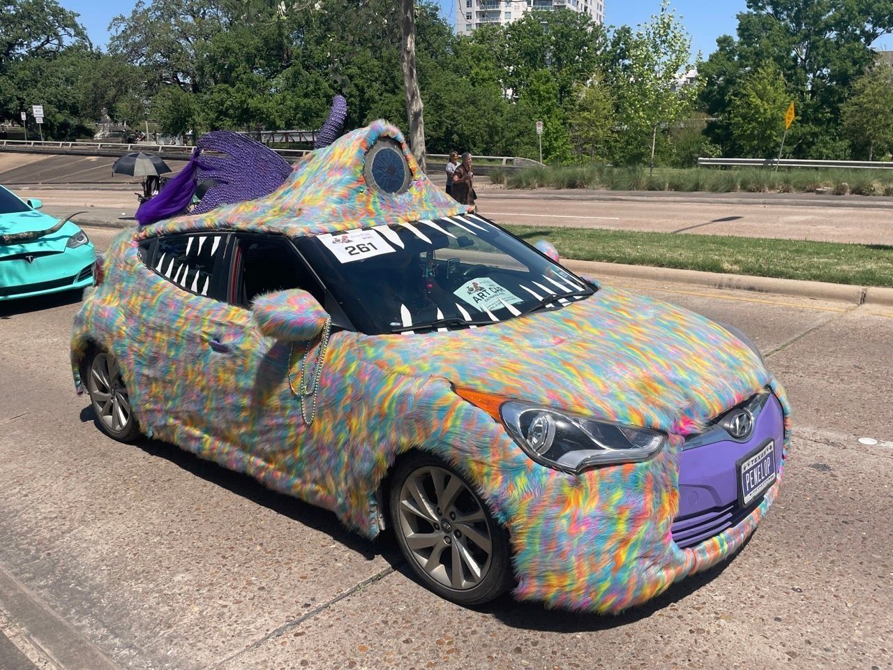 Daily Driver 1st-2018-purple fur - new fur and other additions in 2024---- Penelope’s fur is a vibrant tapestry of colors—think of all the hues of a sunset blended together! As she glides through the streets, she leaves a trail of sparkles and laughter behind her. With her single, large eye twinkling with curiosity, Penelope is always on the lookout for new friends and adventures, ready to spread joy wherever she goes! Designed by Artist Felizabeth Smiley---- After relocating to Texas, from Alaska, with my two children, I discovered a new passion that would change my life: found art. I now own JD Metals, a thriving scrapyard where I transform discarded materials into unique artistic creations. My journey into the world of Artcars was unexpected—I had no idea the car I decorated so I could spot it in a parking lot was an Artcar. The vibrant Artcar community found me and inspired my creativity. The highlight of Artcar week is witnessing the incredible artwork on wheels and connecting with fellow creators who share a love for this unique form of expression. Each Artcar tells a story, and being a part of this community has enriched my life and fueled my artistic spirit. Through my work, I aim to celebrate the beauty of transformation and the power of collaboration.
