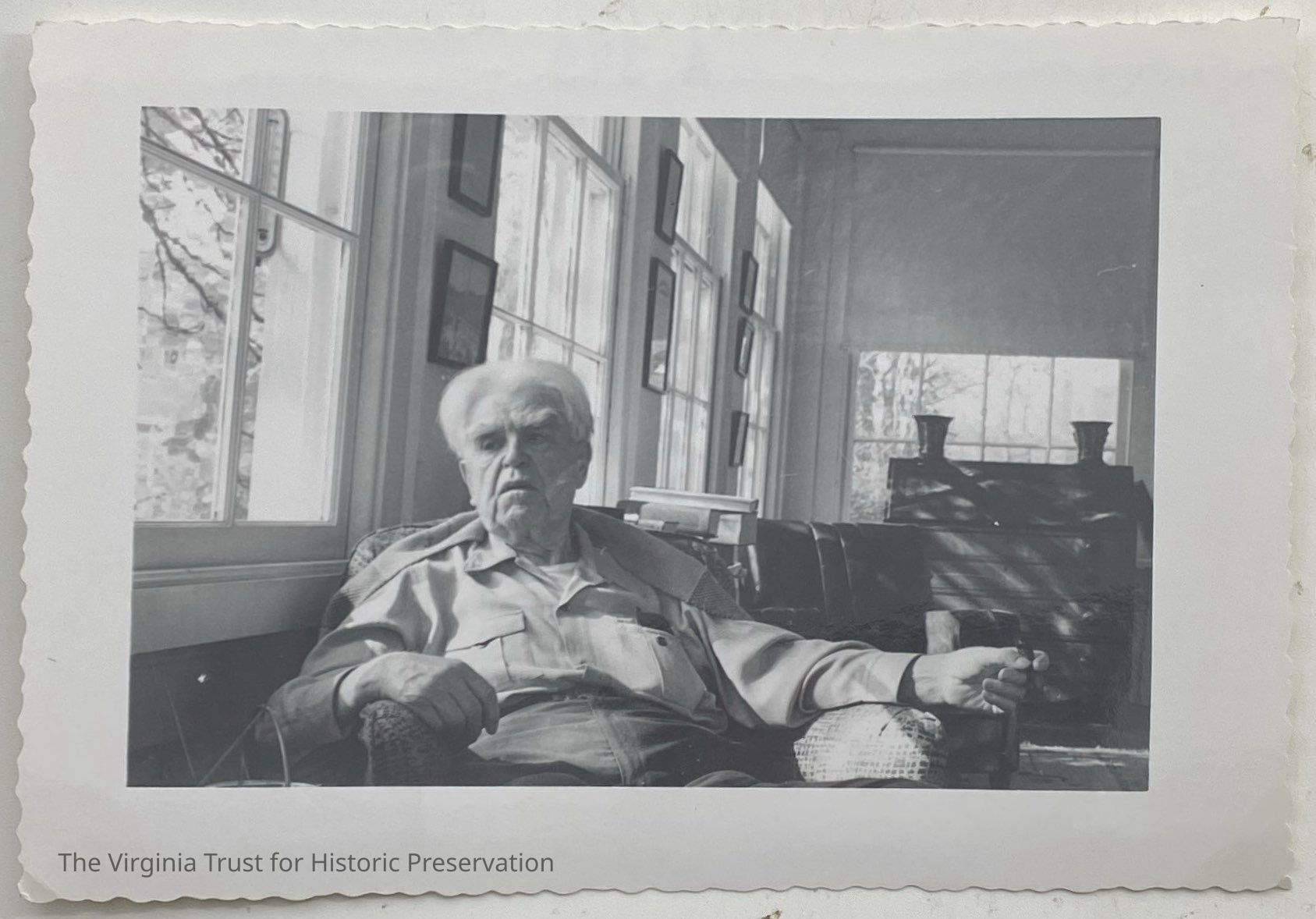 Black and white photograph of John L. Lewis sitting on a chair, holding a cigar, and looking to the side. Lewis sits in the back porch of the Lee-Fendall House. Furniture and windows in the background.White border and curved edges.