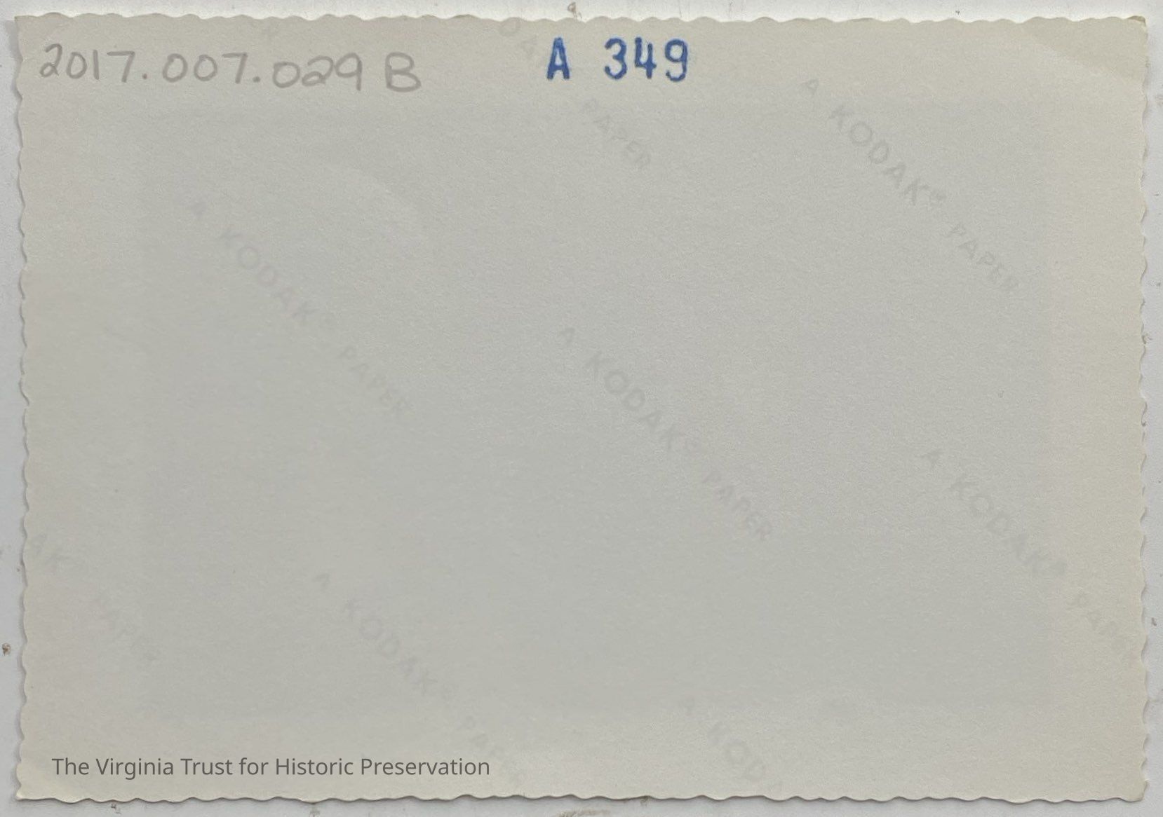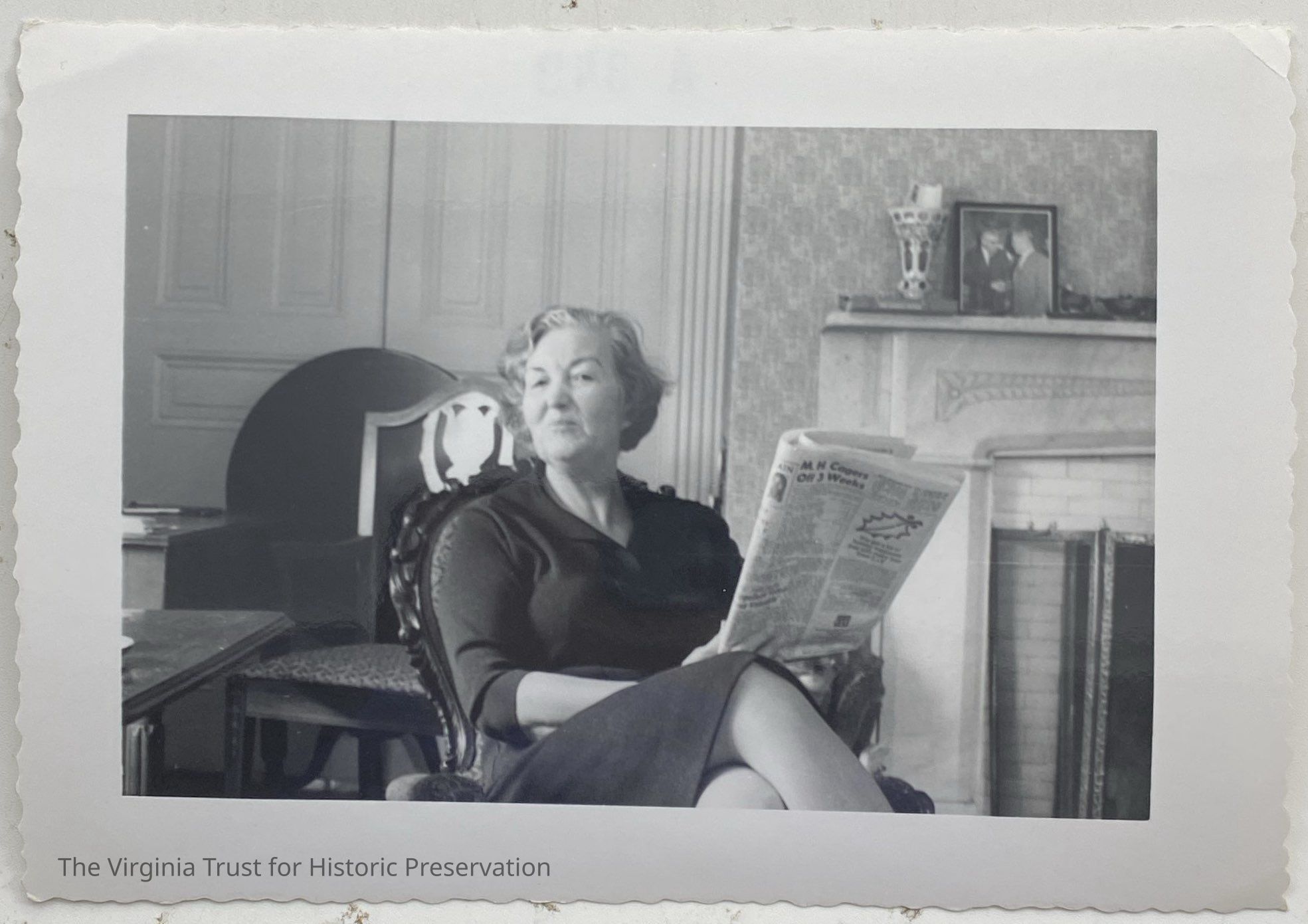 Black and white photograph of Ms. Edith C (face tilted towards the left) sitting in a chair and holding a newspaper in the South Parlor of the Lee-Fendall House. Chairs, a door, and a mantle in the background. White border, scalloped edges.
