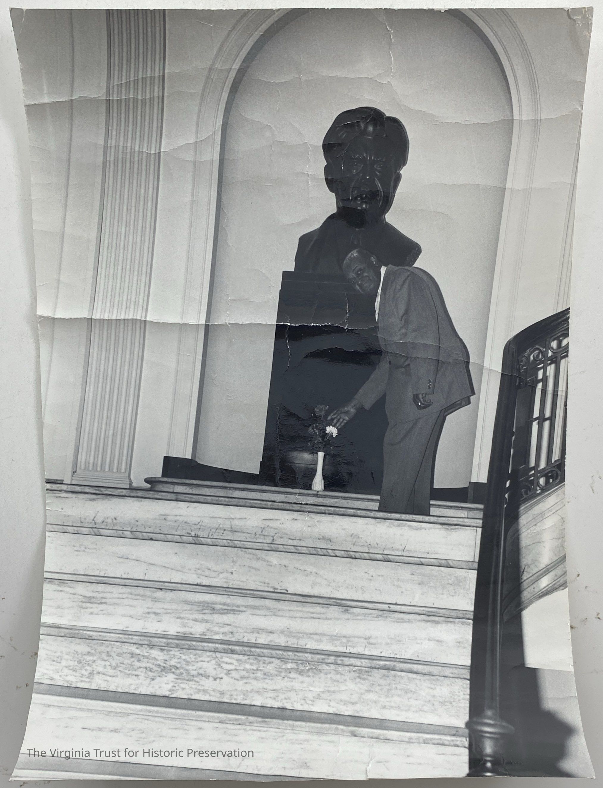Black and white photograph of James Lewis, Jr. laying flowers in front of the John L. Lewis statue at the United Mine Workers of America headquarters in Washington, D.c. Lewis wears a gray suit. Stair rail in foreground and to the right side of photograph.