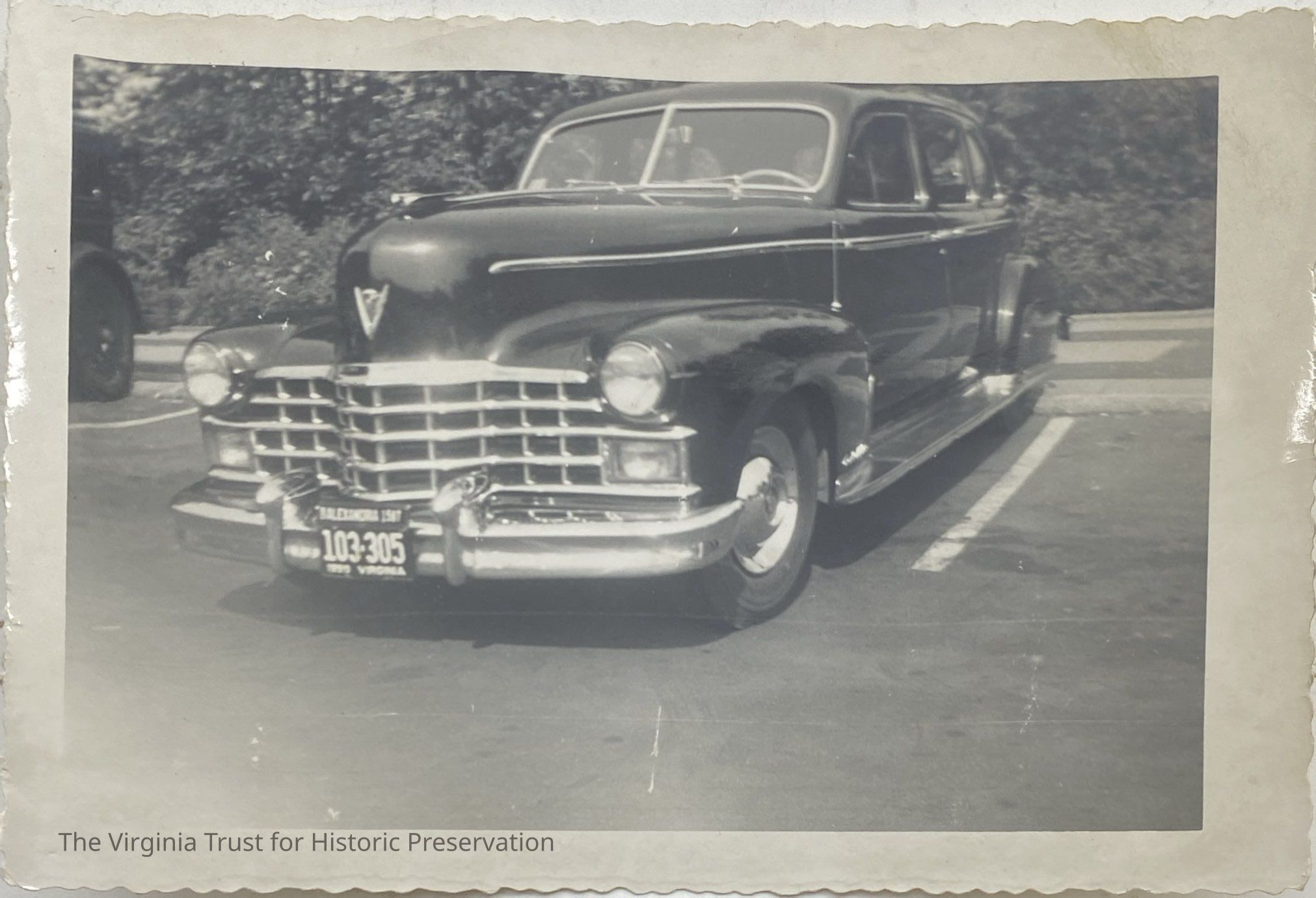 Black and white photograph of a Cadillac car in a parking space. Alexandria license plate: 103-305”. Trees in background. Grooved cut edges.