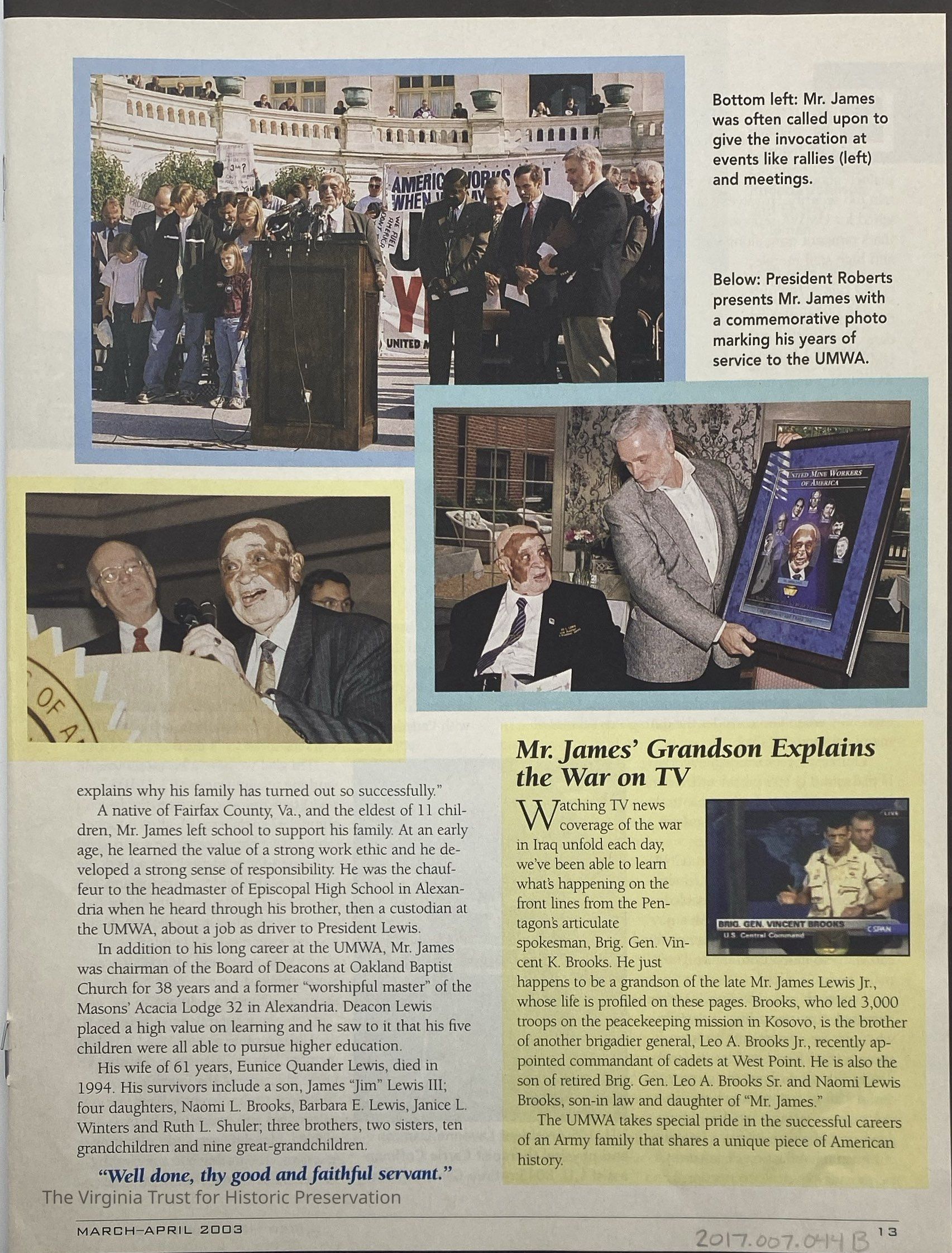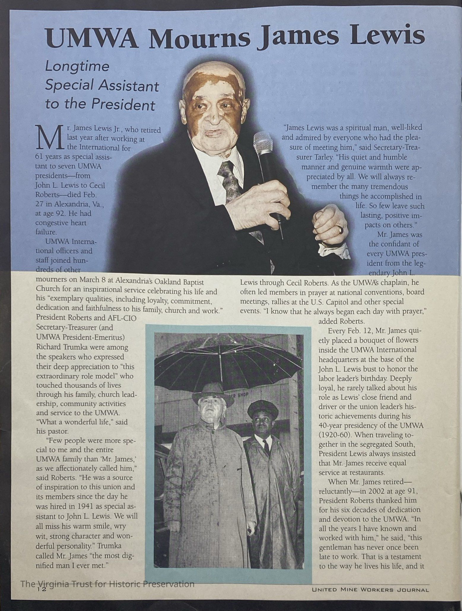 Two-page article on the life and legacy of James Lewis, Jr in the March-April 2003 UMWA Journal. Includes photos of James Lewis with John and older photographs of him.