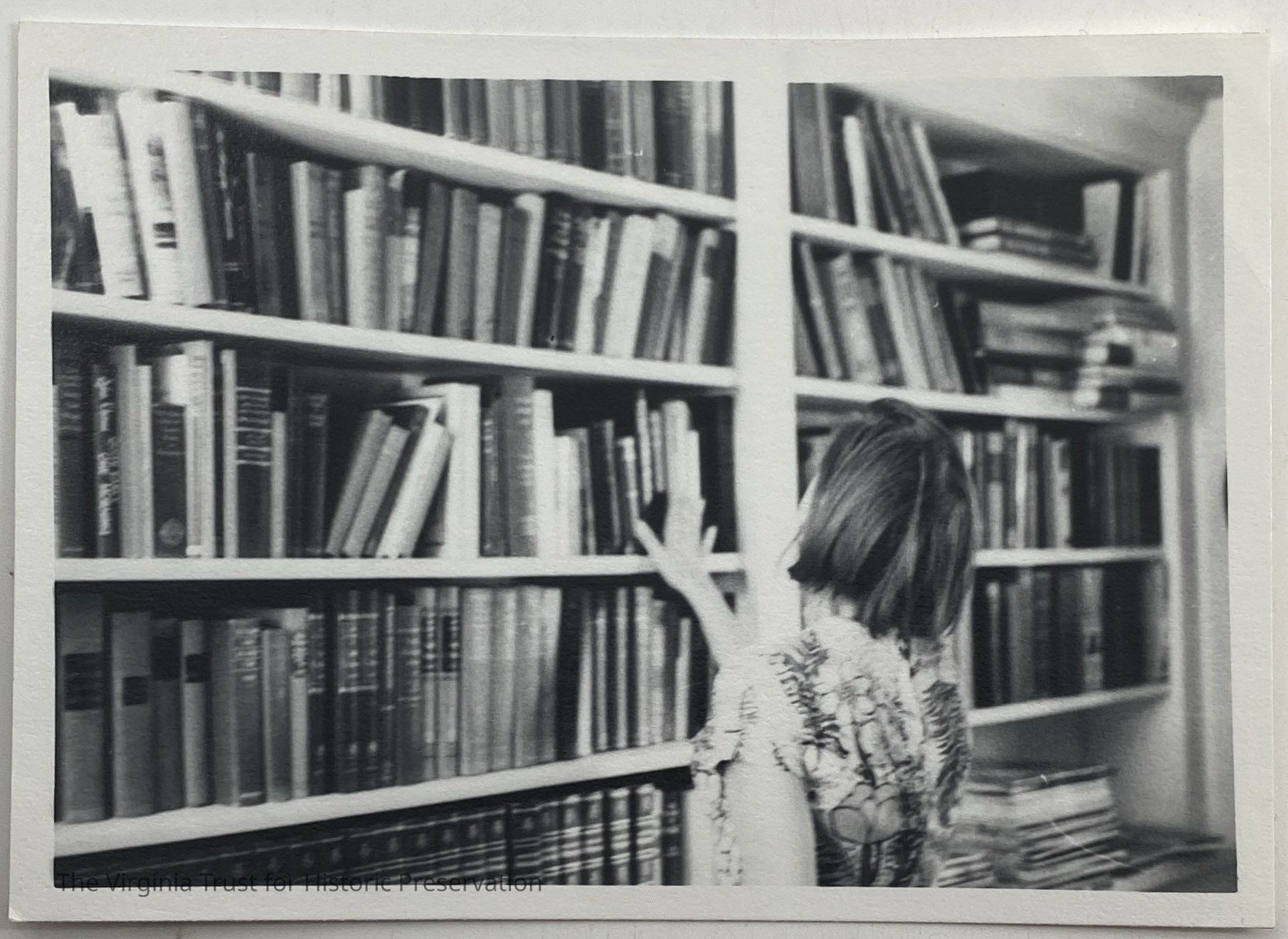 Black and white photograph of a woman (turned away from camera) looking at bookshelves. Located in the Lee-Fendall House (Lewis Library today). Many books along the shelves. White border with straight edges.Dimensions