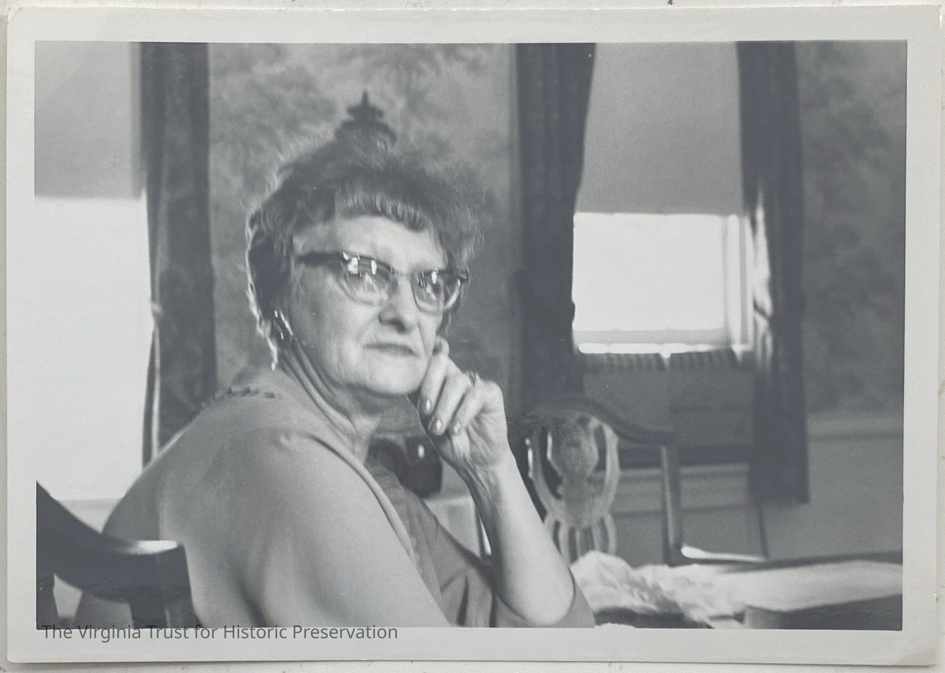 Black and white horizontal photograph of an unknown woman wearing glasses, facing the camera, and a hand resting on her face. Sitting at the table in the dining room during the Lewis residence. White border with straight edges.