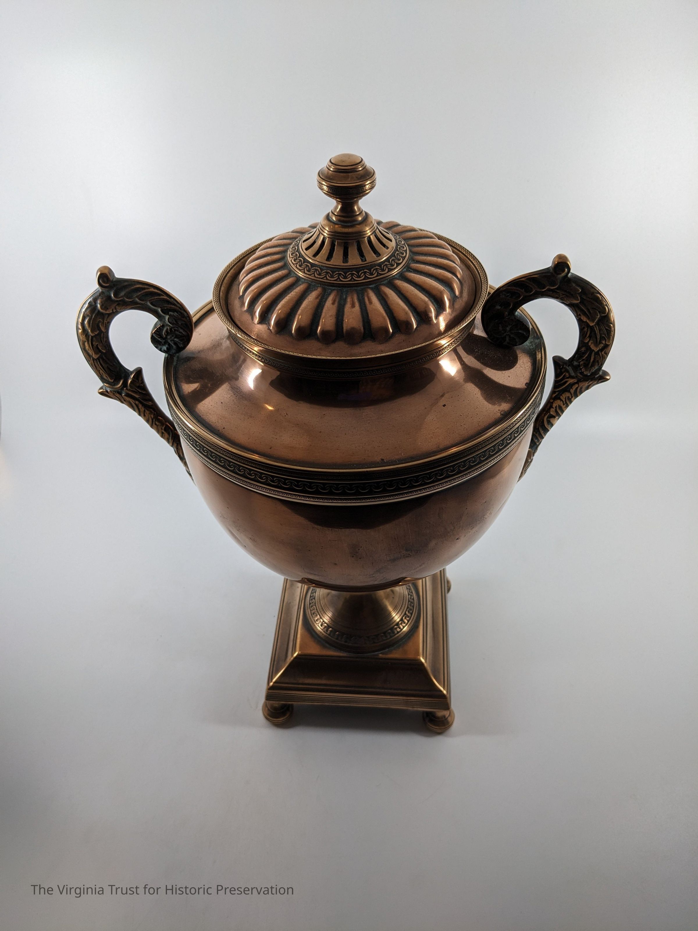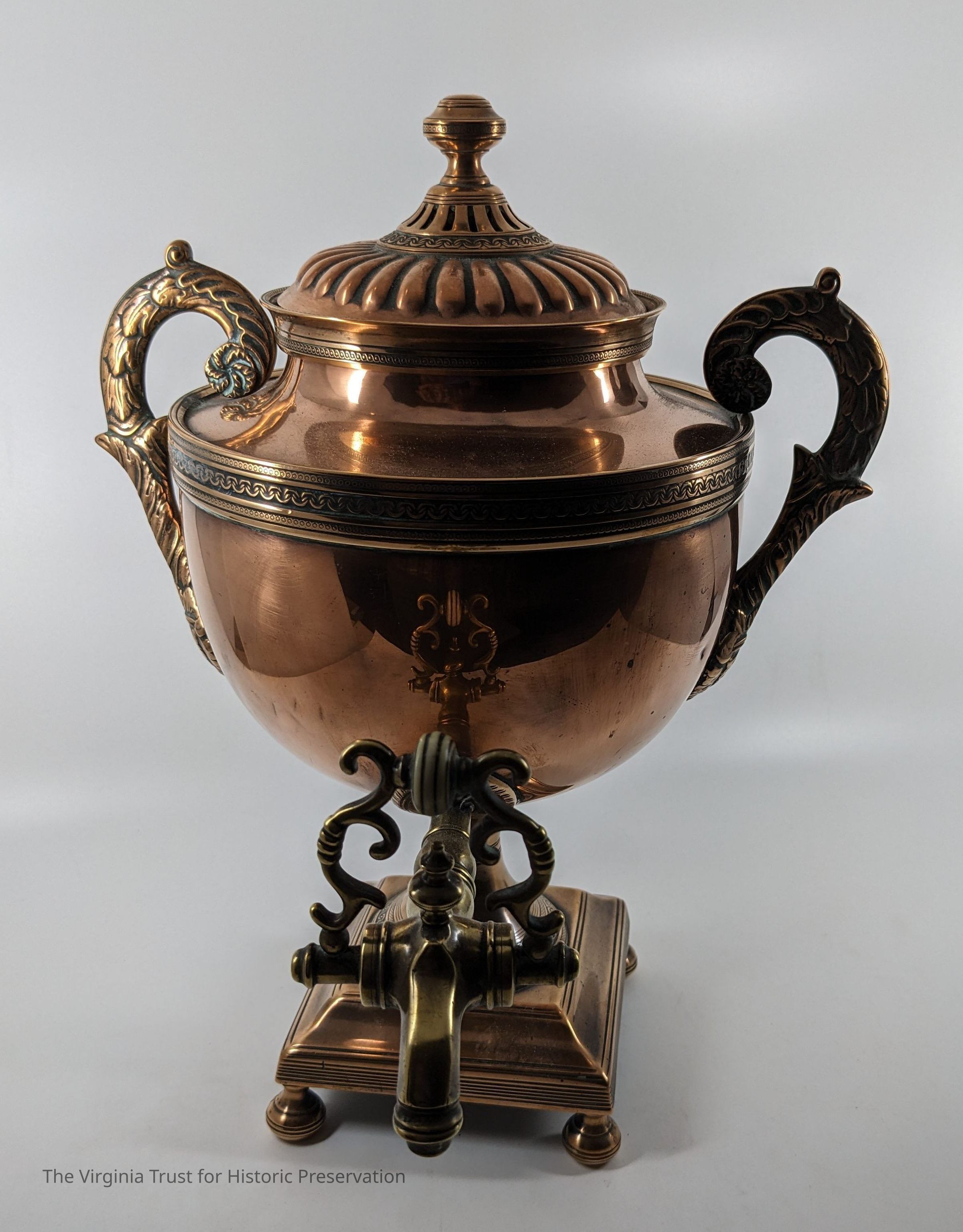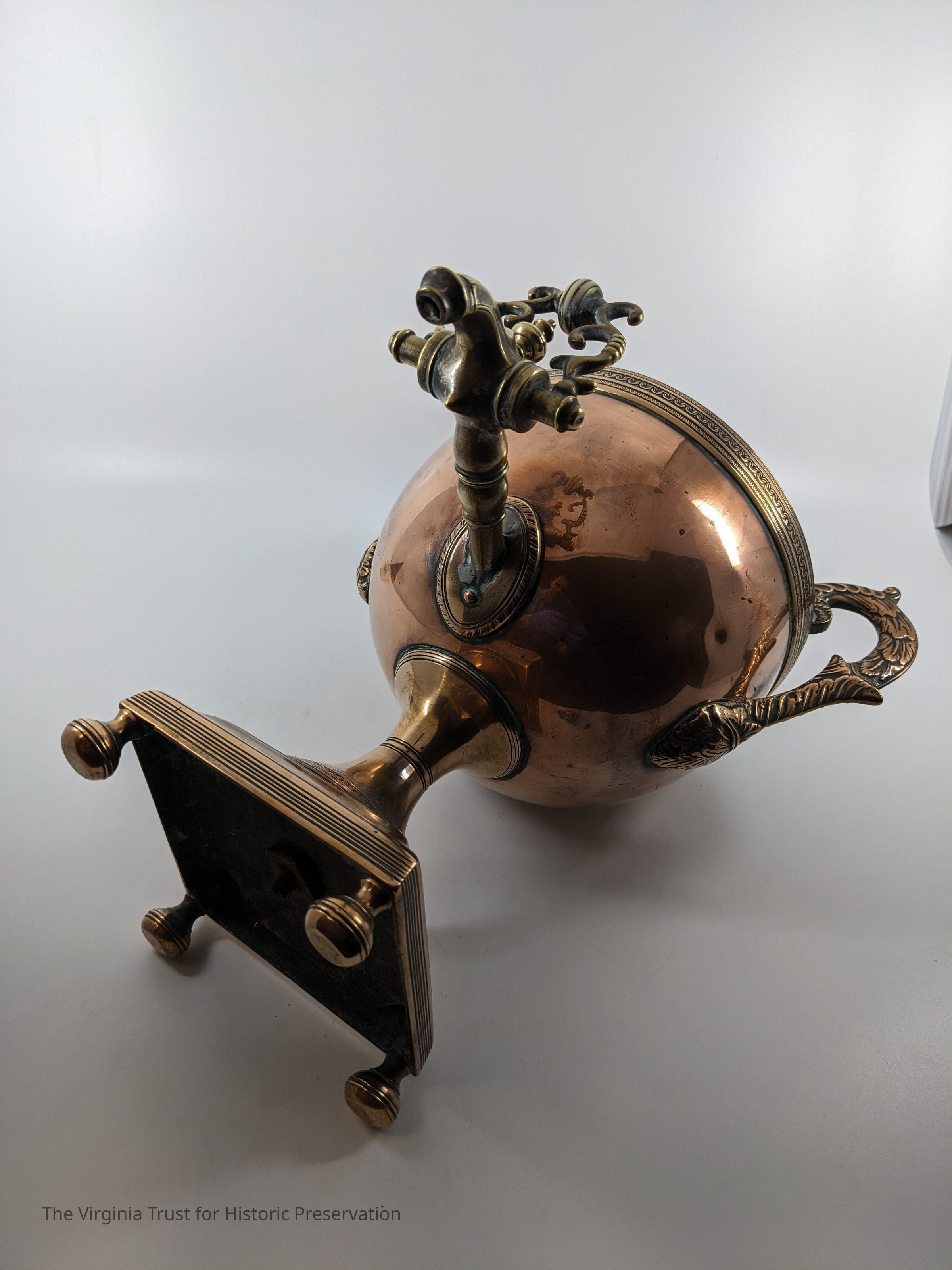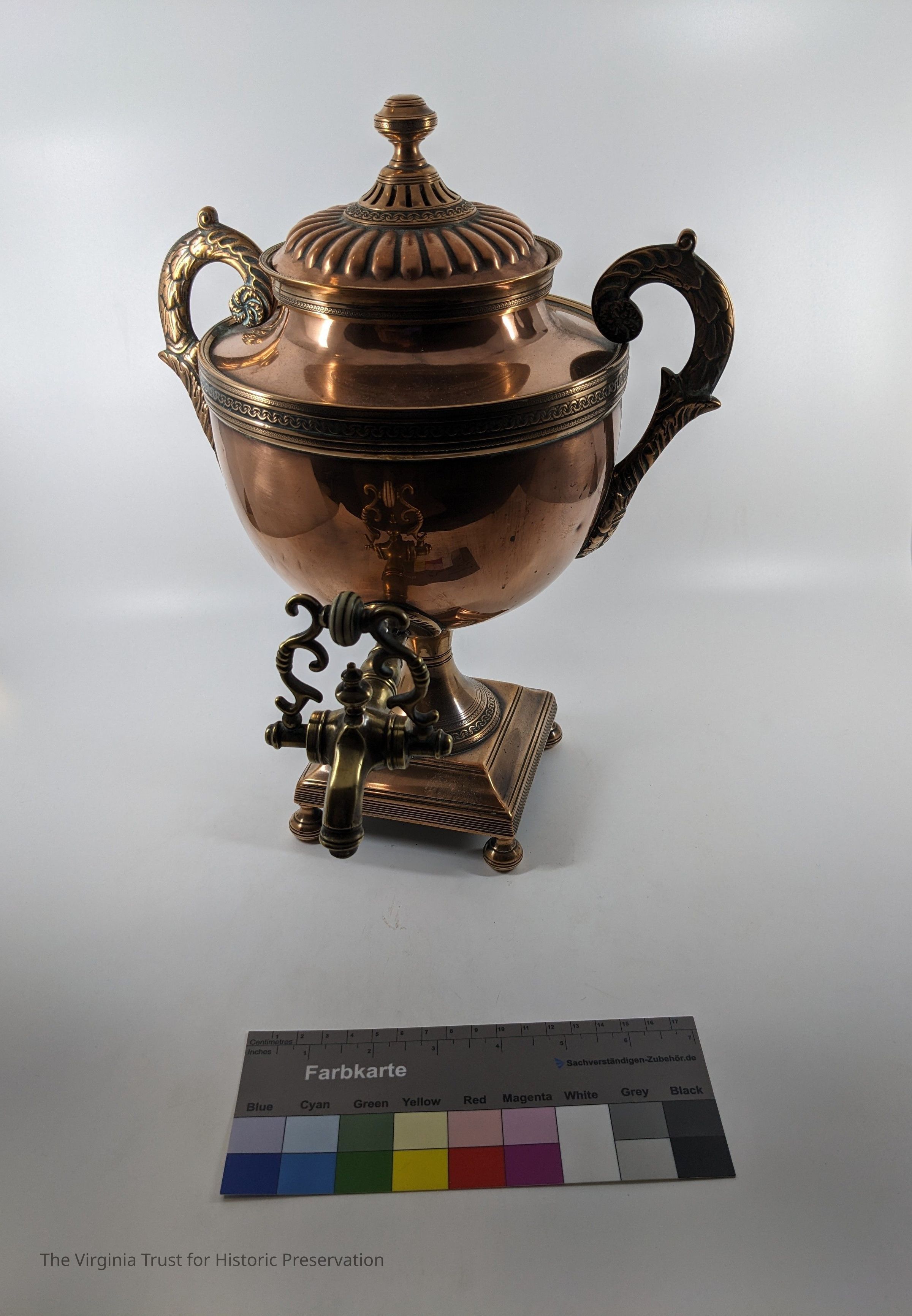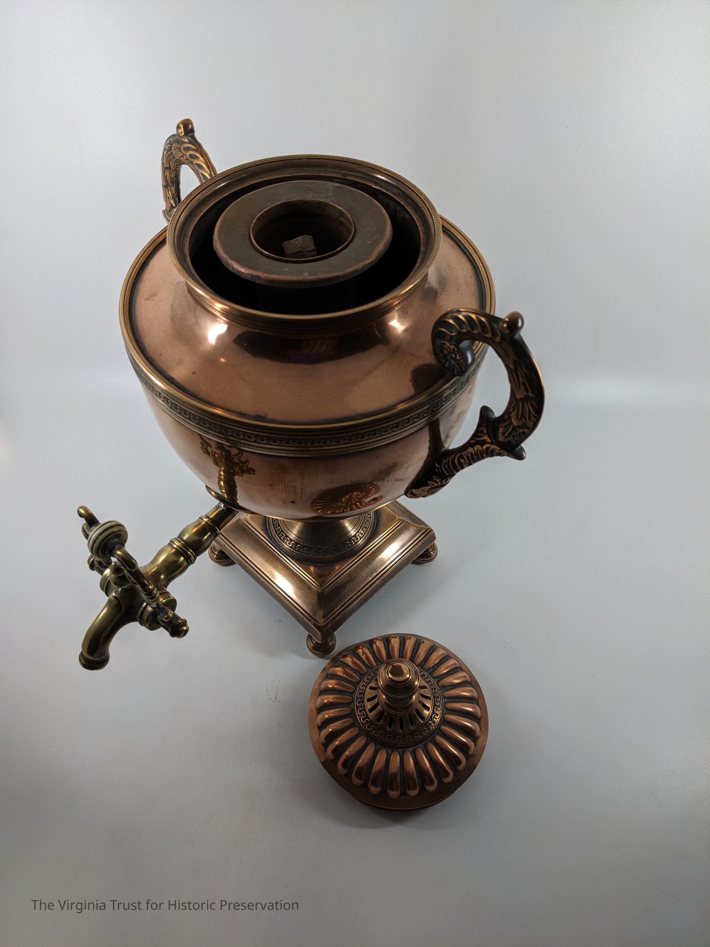 Copper samovar body with decorative handles, round feet; tap possibly brass; heating stone inside. Dated 1825