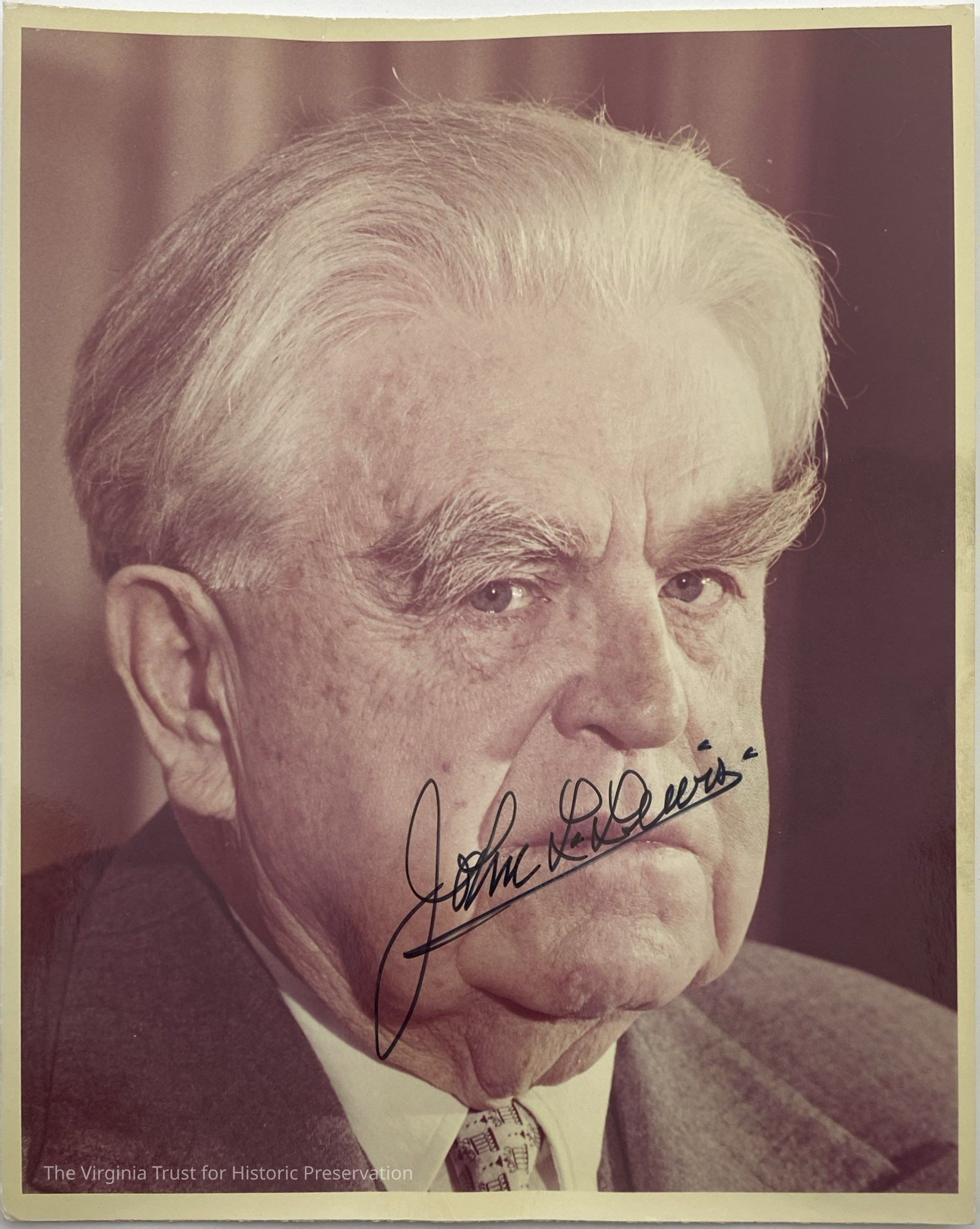 Reproduction colored photograph of a John L. Lewis headshot. Close-up of an older Lewis with his autograph going across his mouth.