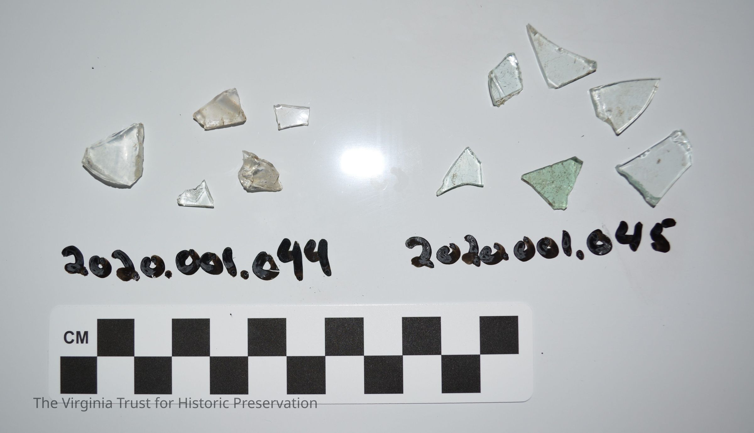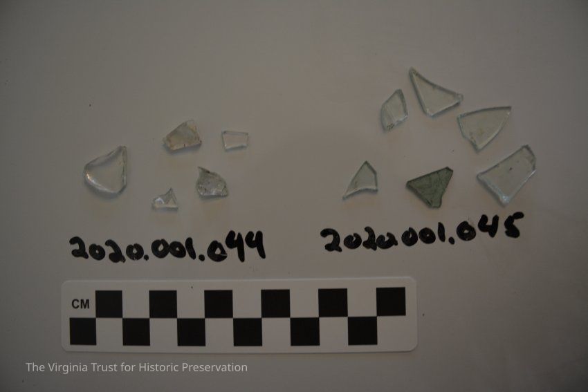 Five pieces of light blue glass and one piece of blue-green glass Archaeology collection gifted to the Alexandria Archaeology Museum on July 28, 2022.