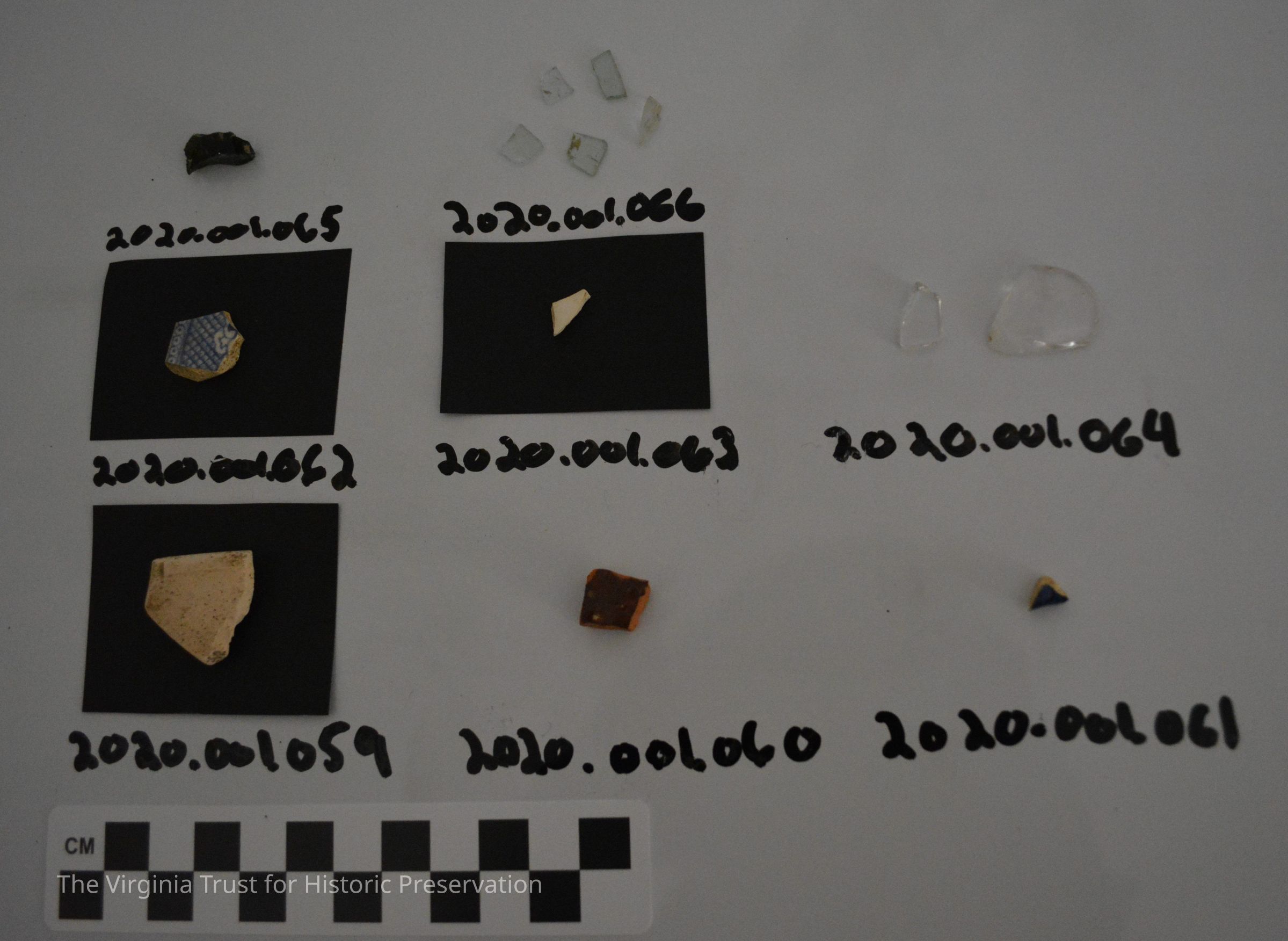 Five pieces of light blue glass and one piece of clear glass Archaeology collection gifted to the Alexandria Archaeology Museum on July 28, 2022.