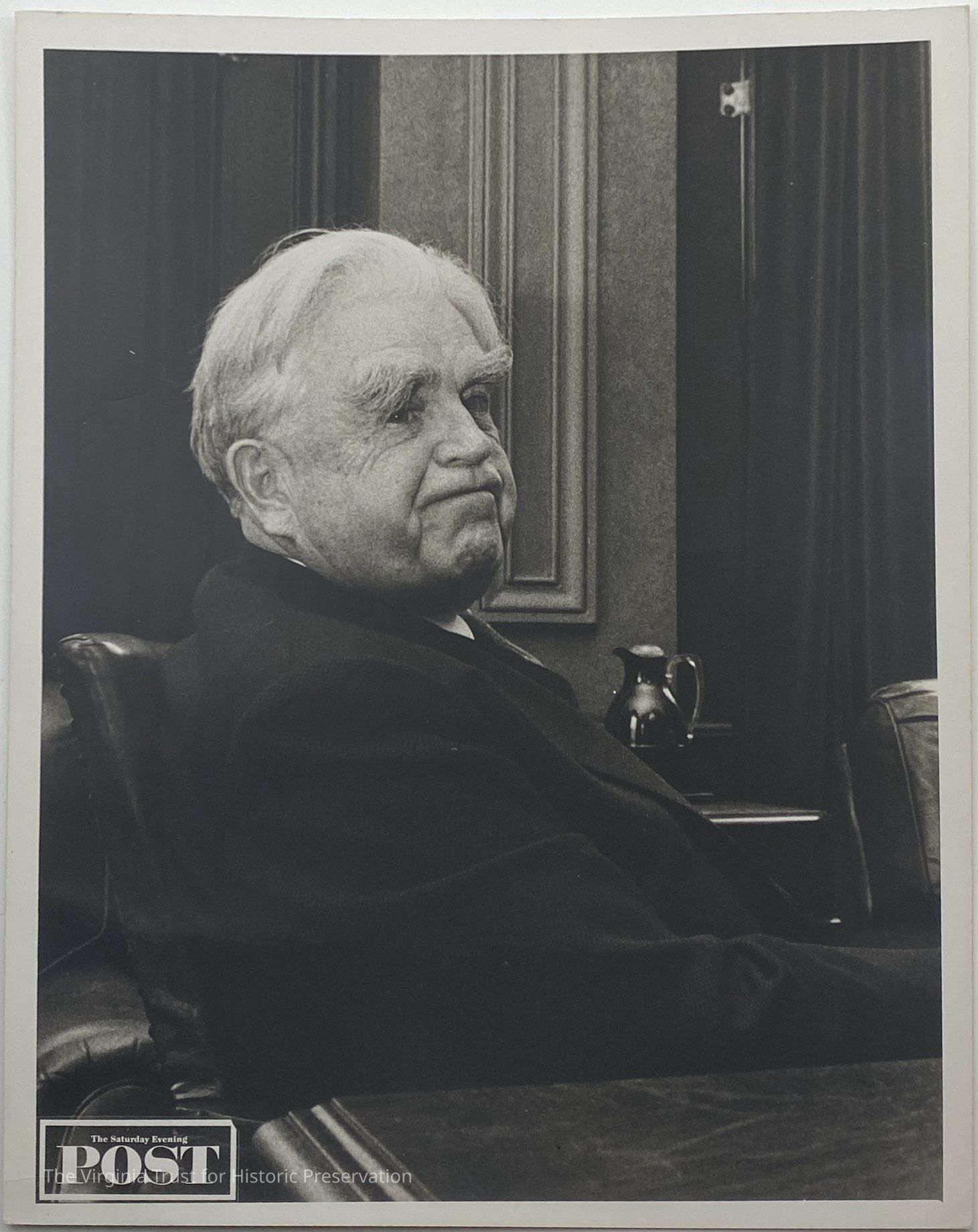 Black and white reproduction photograph of John L. Lewis for the Saturday Evening Post. A older Lewis sits in a chair with a half-smile. Side profile.