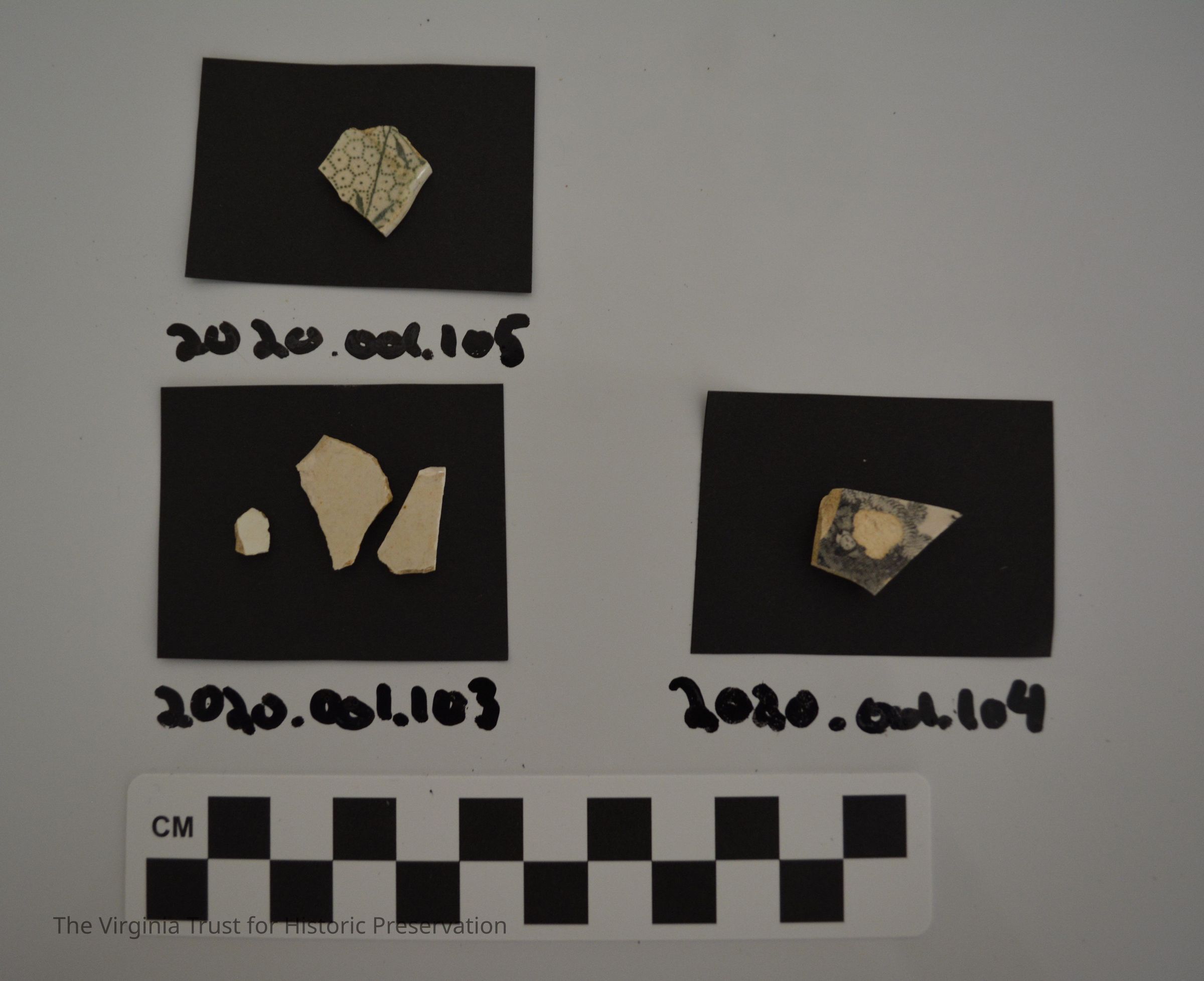 A piece of transfer-printed whiteware-white on one side and black and white floral pattern on the other Archaeology collection gifted to the Alexandria Archaeology Museum on July 28, 2022.