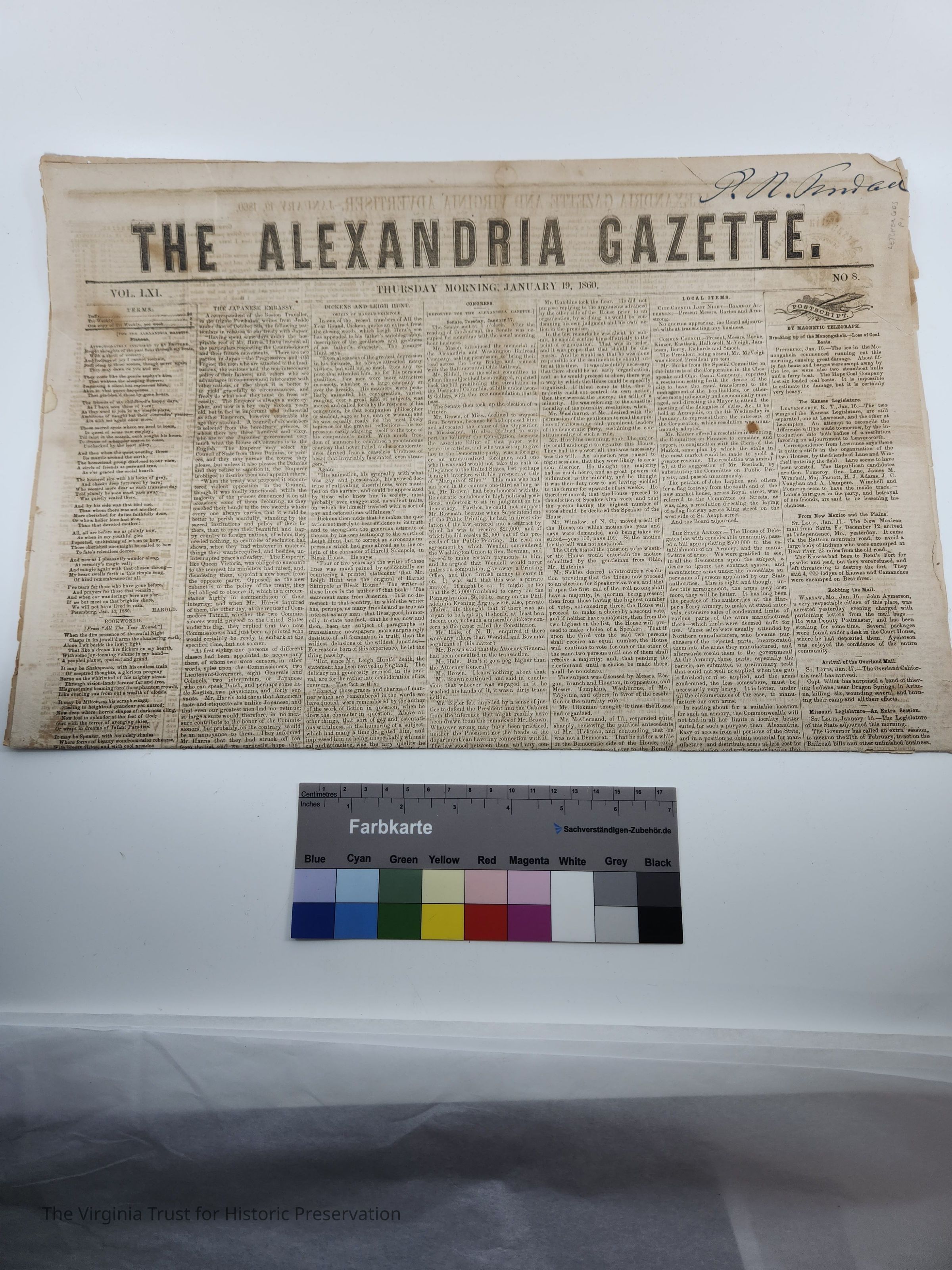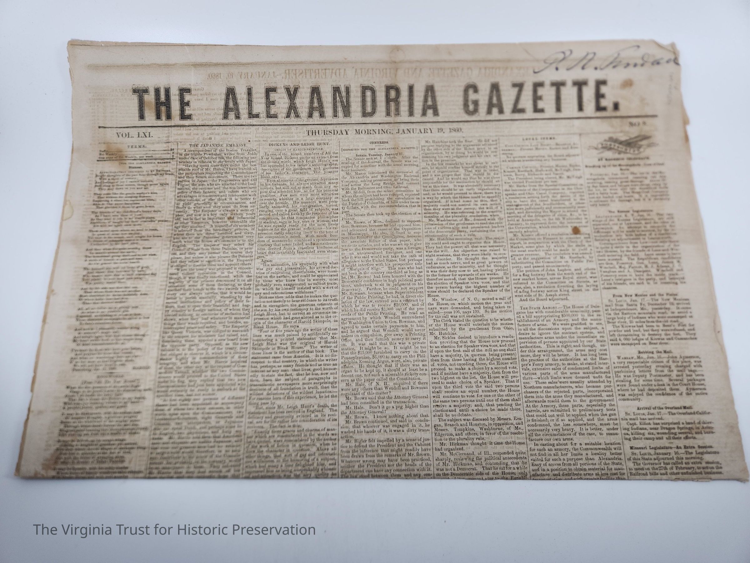January 19, 1860 morning edition of The Alexandria Gazette. An included article is a report from the Japanese Embassy regarding the reaction of the Japanese princes to the Treaty of Japan. Report of the proceedings of the U.S. Senate of January 17, 1860. Fendall's signature in the top right corner.Dimensions