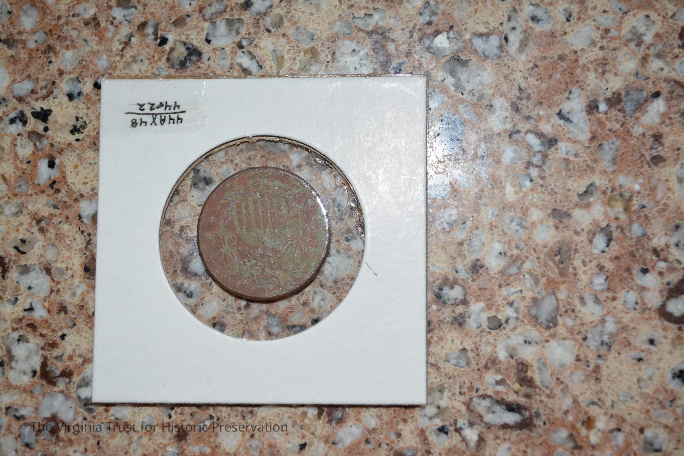 An 1867 Shield Nickel Archaeology collection gifted to the Alexandria Archaeology Museum on July 28, 2022.