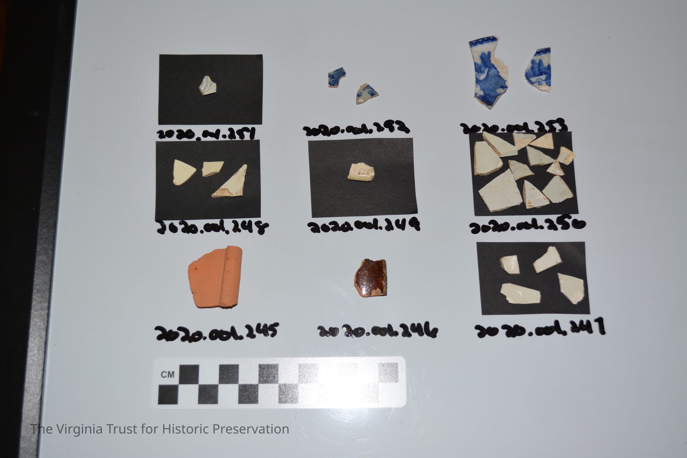 Two pieces of pearlware-transfer-printed blue with stipple-refit; both surfaces decorated Archaeology collection gifted to the Alexandria Archaeology Museum on July 28, 2022.