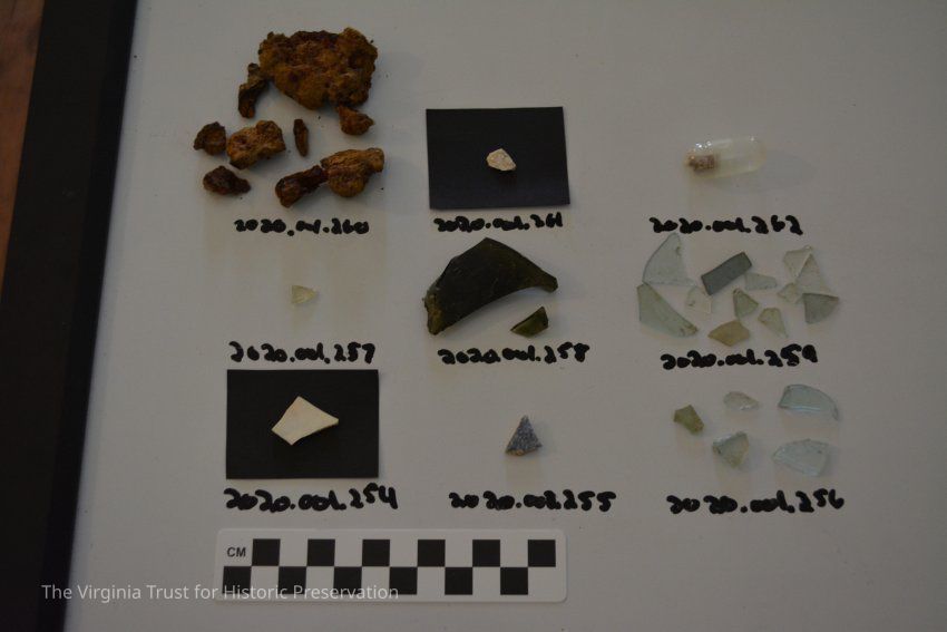 Five pieces of glass from an unidentified bottle/jar body-three light blue pieces, one green, and one clear Archaeology collection gifted to the Alexandria Archaeology Museum on July 28, 2022.