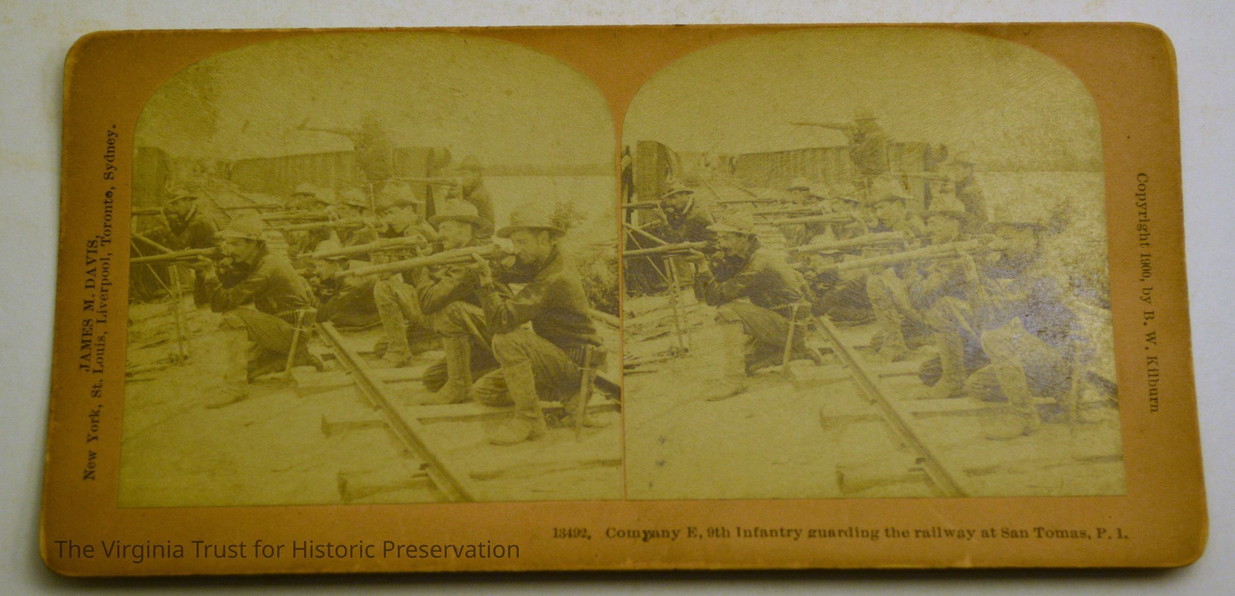 Stereograph titled "Company E, 9th Infantry guarding the railway at San Tomas, P.1.". 13492. Copyright 1900 by B.W. Kilburn. Artist: James M. Davis.