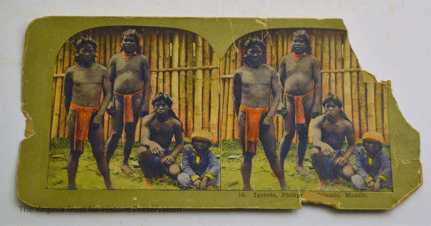 Stereograph titled "16- Igorots, Philippine Islands, Manila". No Date. Much thinner than most stereographs, possibly hand-tinted.