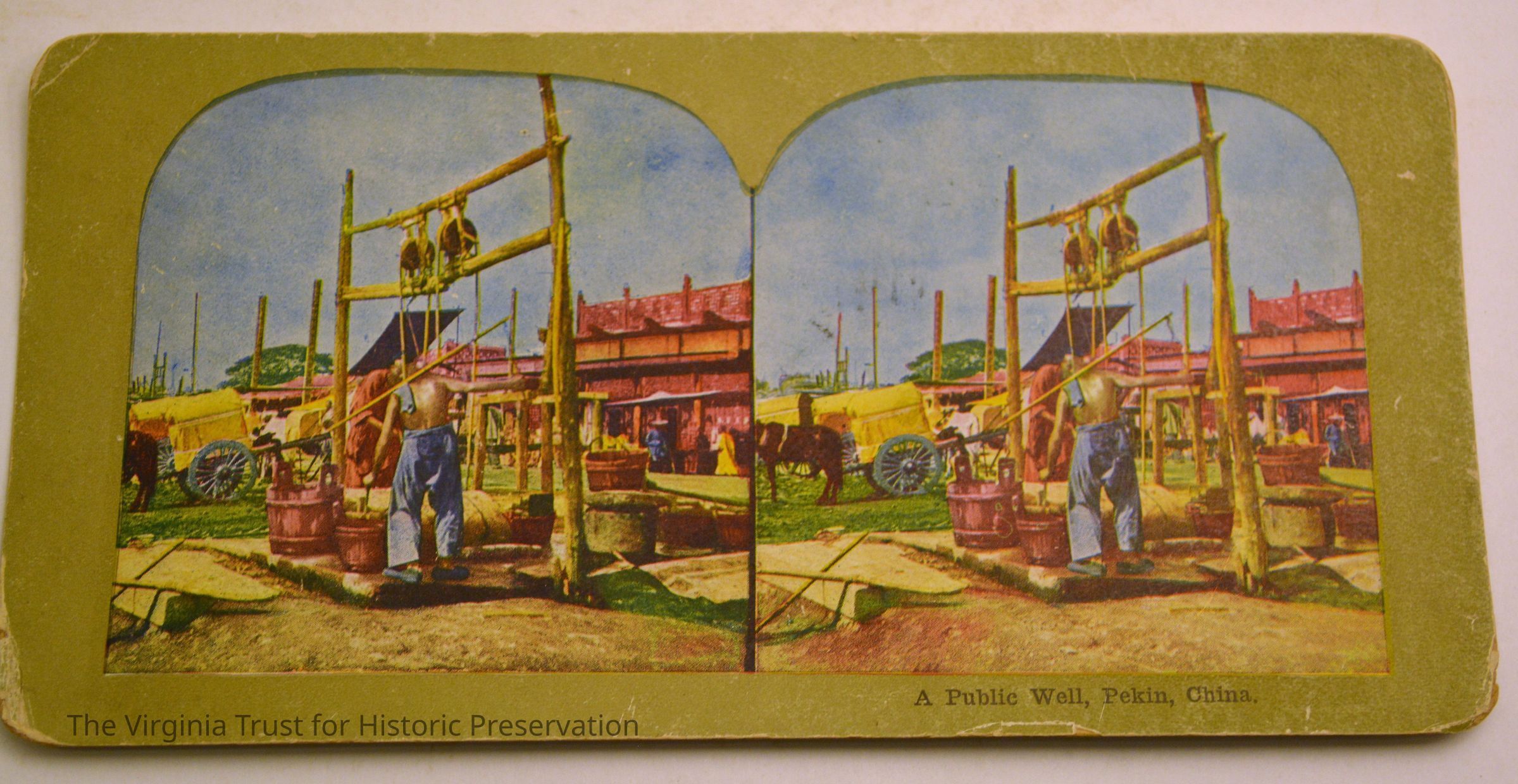 Stereoscopic slide titled "A Public Well, Pekin, China". Colored.